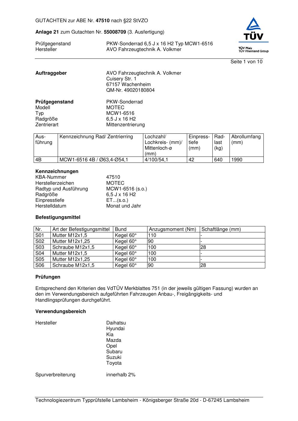 Dieses Gutachten (abe) bezieht sich auf die Alufelge ATS MCW1 -6516 in der Ausführung 6.5Jx16 ET 0, Mittenloch 0 mm (KBA 47510). Im PDF findest du typischerweise zulässige Reifengrößen, Auflagen/Anbauhinweise und – je nach Dokument – Hinweise zur Eintragung.