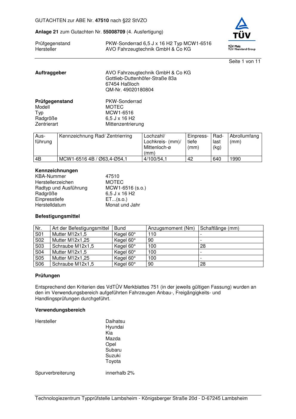 Dieses Gutachten (abe) bezieht sich auf die Alufelge ATS MCW1 -6516 in der Ausführung 6.5Jx16 ET 0, Mittenloch 0 mm (KBA 47510). Im PDF findest du typischerweise zulässige Reifengrößen, Auflagen/Anbauhinweise und – je nach Dokument – Hinweise zur Eintragung.