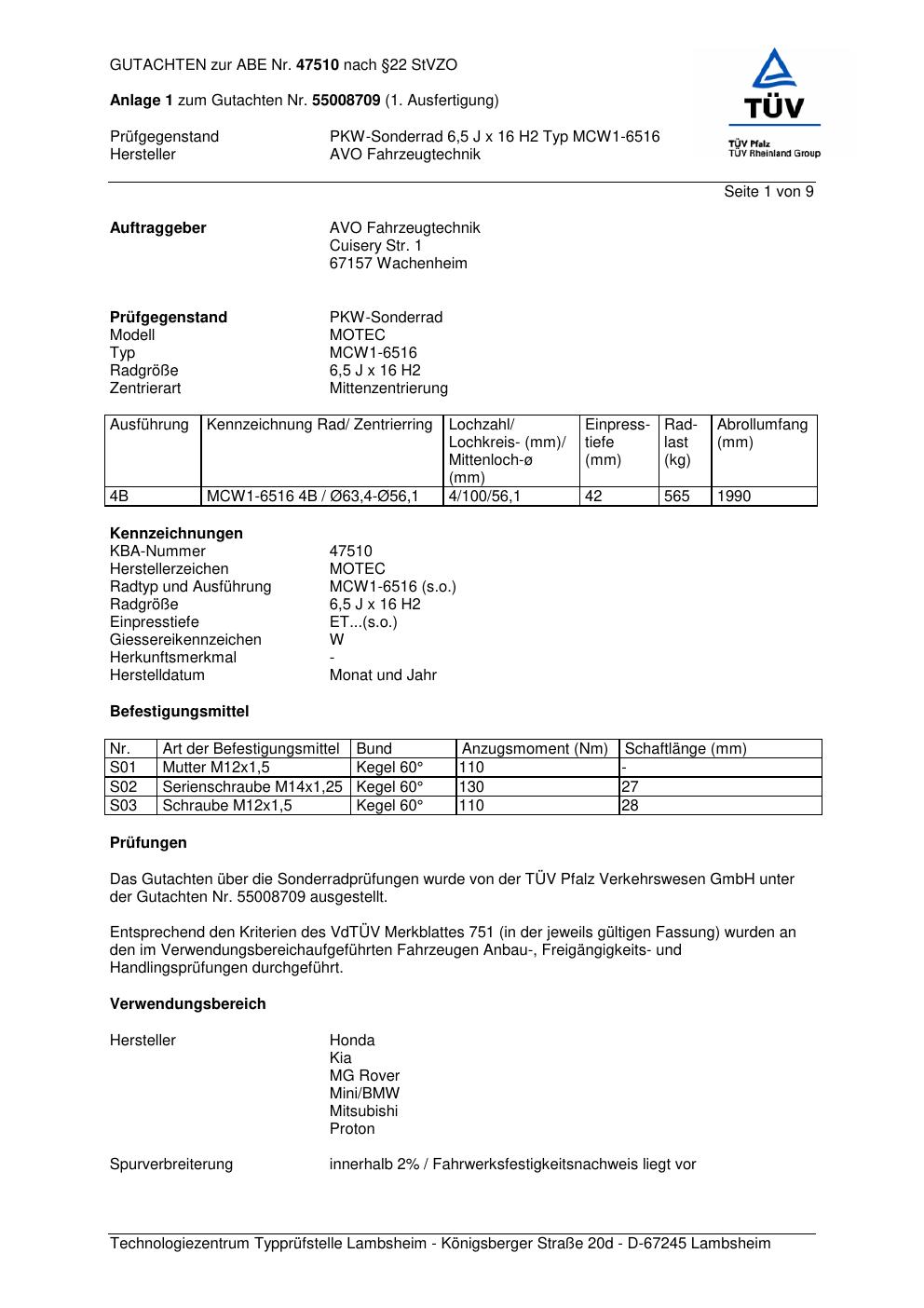 Felgengutachten / abe für Alufelgen co-rod MCW1 -6516 (6.5Jx16 ET 0, Mittenloch 0 mm) mit KBA 47510 (Zertifikatsnummer 47510). Hier kostenlos als PDF herunterladen. Der Download-Link ist 24 Stunden gültig und kann bis zu zwei Mal verwendet werden.