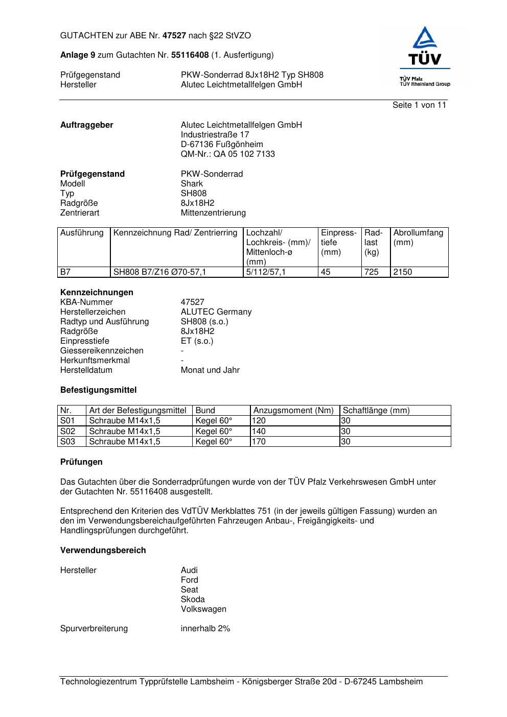Dieses Gutachten (abe) bezieht sich auf die Alufelge ALUTEC SH808 in der Ausführung 8Jx18 ET 0, Mittenloch 0 mm (KBA 47527). Im PDF findest du typischerweise zulässige Reifengrößen, Auflagen/Anbauhinweise und – je nach Dokument – Hinweise zur Eintragung.