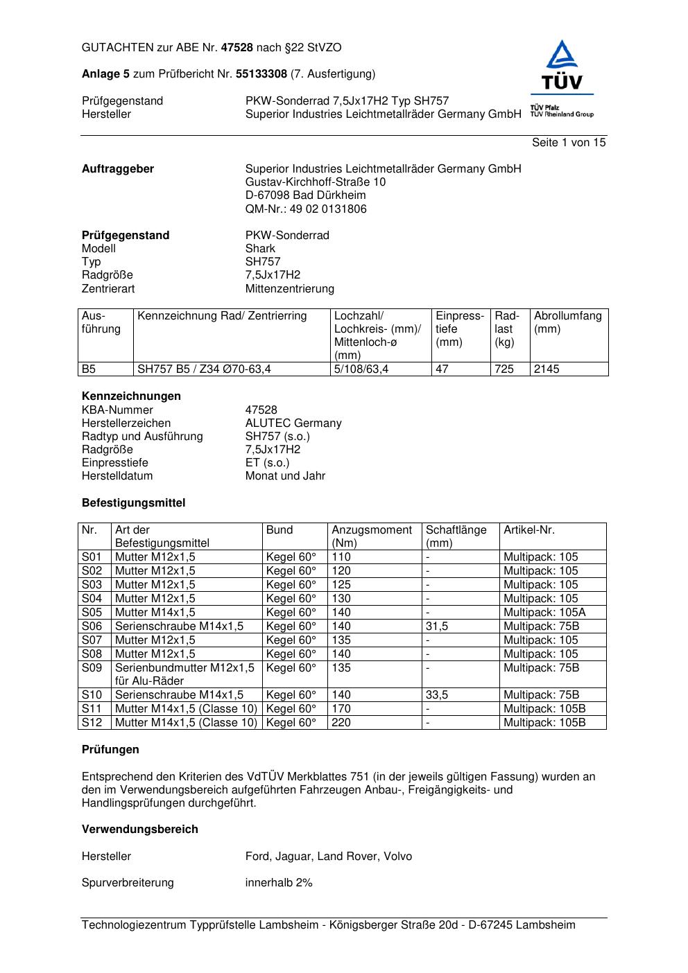 Dieses Gutachten (abe) bezieht sich auf die Alufelge ALUTEC SH757 in der Ausführung 7.5Jx17 ET 0, Mittenloch 0 mm (KBA 47528). Im PDF findest du typischerweise zulässige Reifengrößen, Auflagen/Anbauhinweise und – je nach Dokument – Hinweise zur Eintragung.