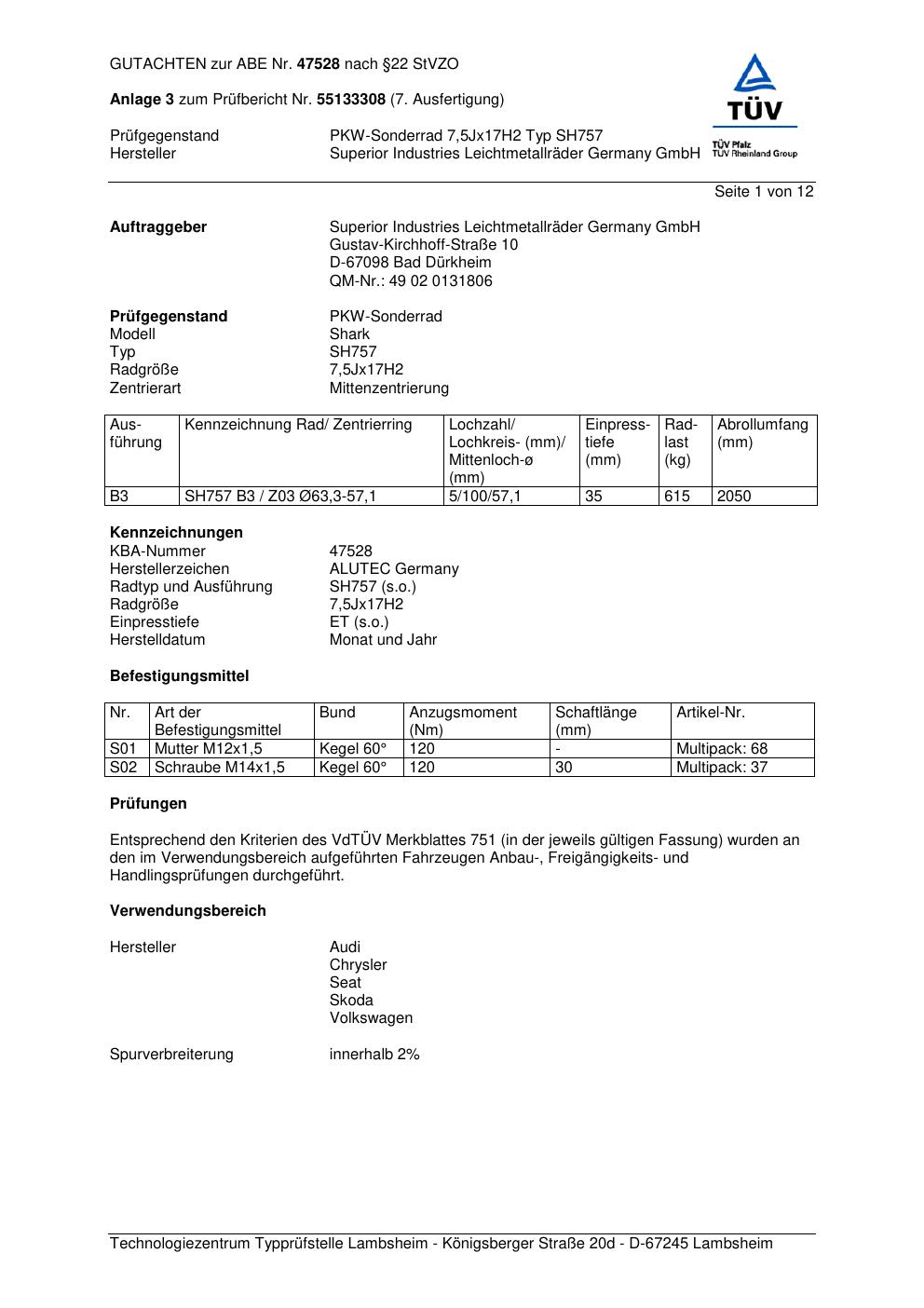 Dieses Gutachten (abe) bezieht sich auf die Alufelge ALUTEC SH757 in der Ausführung 7.5Jx17 ET 0, Mittenloch 0 mm (KBA 47528). Im PDF findest du typischerweise zulässige Reifengrößen, Auflagen/Anbauhinweise und – je nach Dokument – Hinweise zur Eintragung.