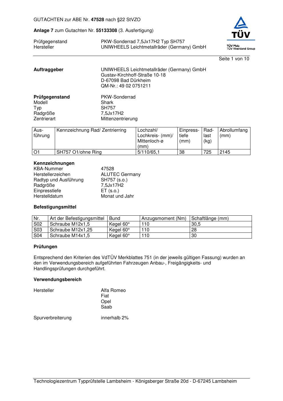Dieses Gutachten (abe) bezieht sich auf die Alufelge ALUTEC SH757 in der Ausführung 7.5Jx17 ET 0, Mittenloch 0 mm (KBA 47528). Im PDF findest du typischerweise zulässige Reifengrößen, Auflagen/Anbauhinweise und – je nach Dokument – Hinweise zur Eintragung.
