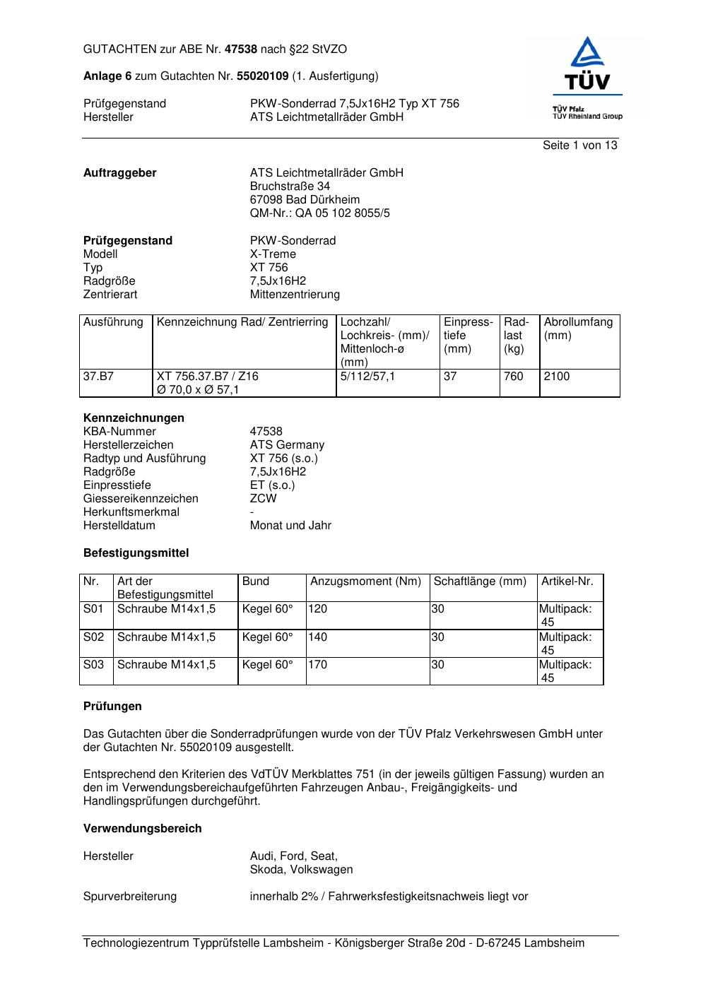 Dieses Gutachten (abe) bezieht sich auf die Alufelge ATS XT 756 in der Ausführung 7.5Jx16 ET 0, Mittenloch 0 mm (KBA 47538). Im PDF findest du typischerweise zulässige Reifengrößen, Auflagen/Anbauhinweise und – je nach Dokument – Hinweise zur Eintragung.