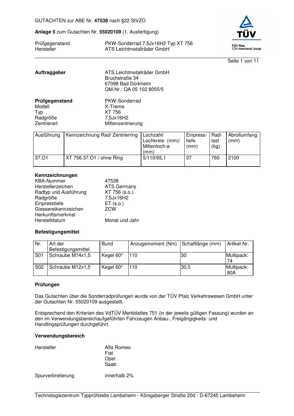 Dieses Gutachten (abe) bezieht sich auf die Alufelge ATS XT 756 in der Ausführung 7.5Jx16 ET 0, Mittenloch 0 mm (KBA 47538). Im PDF findest du typischerweise zulässige Reifengrößen, Auflagen/Anbauhinweise und – je nach Dokument – Hinweise zur Eintragung.