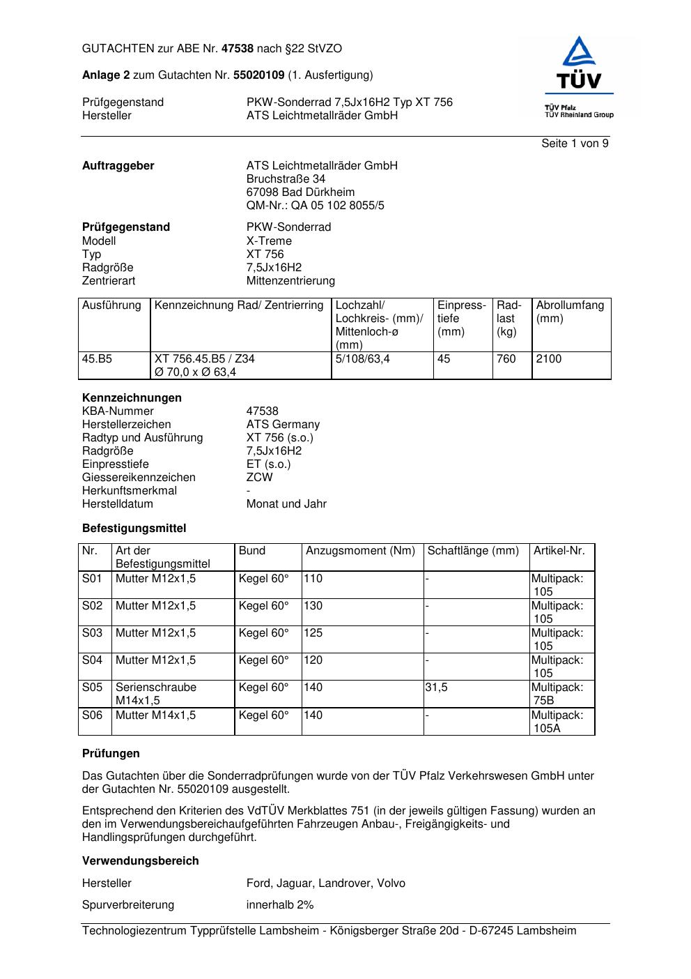 Dieses Gutachten (abe) bezieht sich auf die Alufelge ATS XT 756 in der Ausführung 7.5Jx16 ET 0, Mittenloch 0 mm (KBA 47538). Im PDF findest du typischerweise zulässige Reifengrößen, Auflagen/Anbauhinweise und – je nach Dokument – Hinweise zur Eintragung.