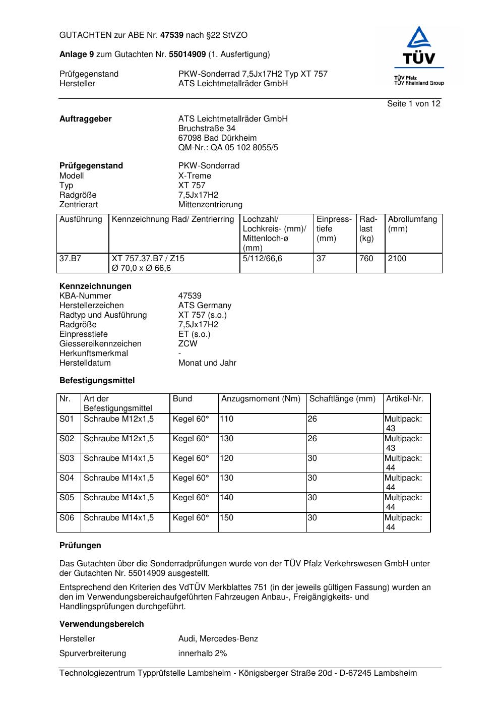 Dieses Gutachten (abe) bezieht sich auf die Alufelge ATS XT 757 in der Ausführung 7.5Jx17 ET 0, Mittenloch 0 mm (KBA 47539). Im PDF findest du typischerweise zulässige Reifengrößen, Auflagen/Anbauhinweise und – je nach Dokument – Hinweise zur Eintragung.