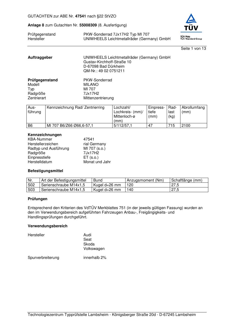 Dieses Gutachten (abe) bezieht sich auf die Alufelge brand-rial MI 707 in der Ausführung 7Jx17 ET 0, Mittenloch 0 mm (KBA 47541). Im PDF findest du typischerweise zulässige Reifengrößen, Auflagen/Anbauhinweise und – je nach Dokument – Hinweise zur Eintragung.