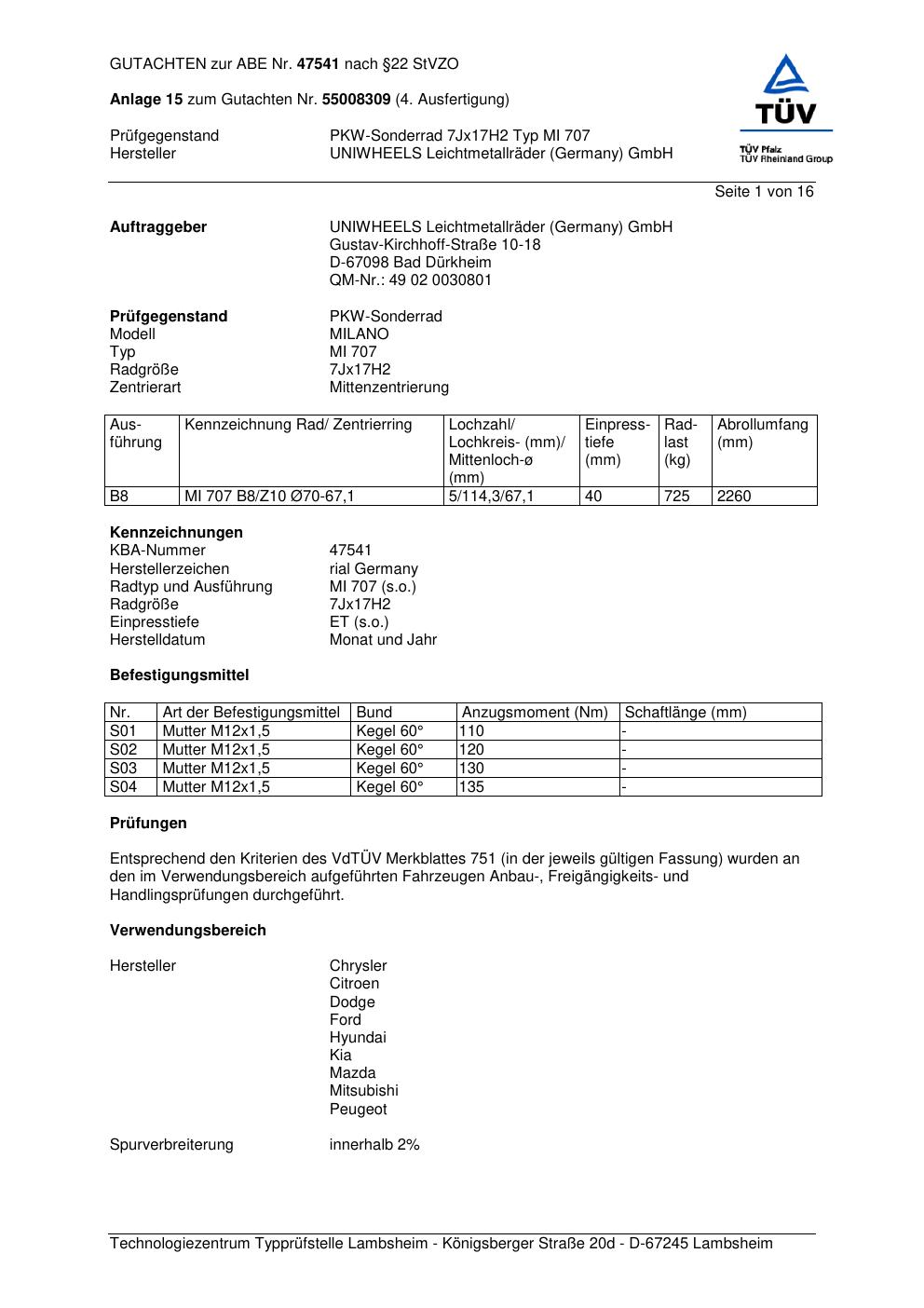 Dieses Gutachten (abe) bezieht sich auf die Alufelge brand-rial MI 707 in der Ausführung 7Jx17 ET 0, Mittenloch 0 mm (KBA 47541). Im PDF findest du typischerweise zulässige Reifengrößen, Auflagen/Anbauhinweise und – je nach Dokument – Hinweise zur Eintragung.