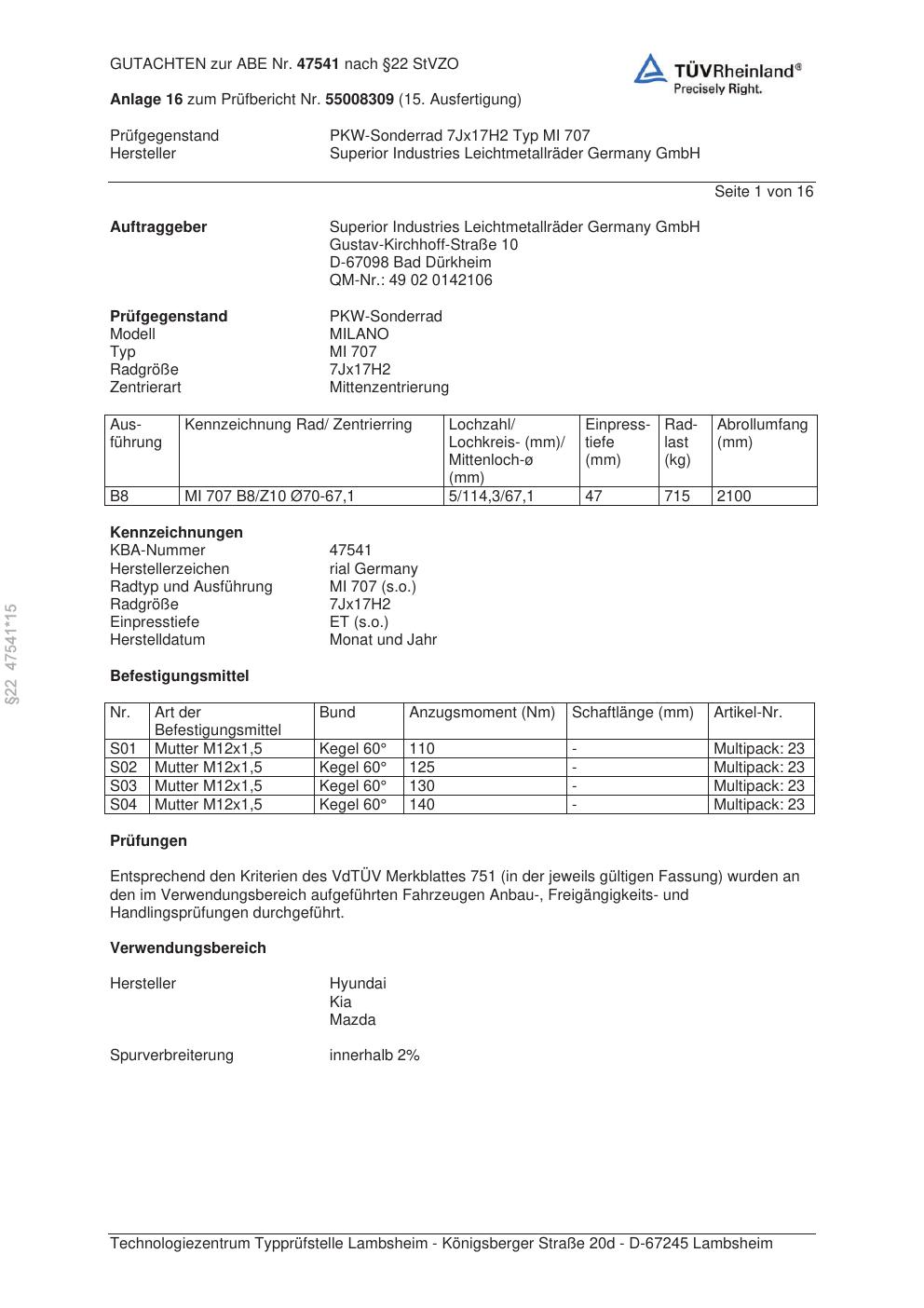 Dieses Gutachten (abe) bezieht sich auf die Alufelge brand-rial MI 707 in der Ausführung 7Jx17 ET 0, Mittenloch 0 mm (KBA 47541). Im PDF findest du typischerweise zulässige Reifengrößen, Auflagen/Anbauhinweise und – je nach Dokument – Hinweise zur Eintragung.