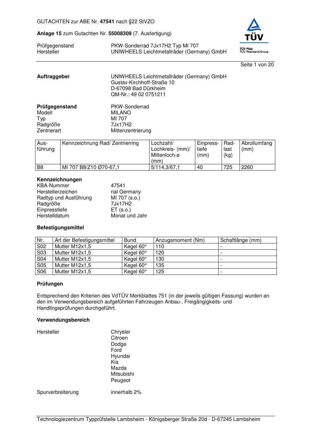 Dieses Gutachten (abe) bezieht sich auf die Alufelge brand-rial MI 707 in der Ausführung 7Jx17 ET 0, Mittenloch 0 mm (KBA 47541). Im PDF findest du typischerweise zulässige Reifengrößen, Auflagen/Anbauhinweise und – je nach Dokument – Hinweise zur Eintragung.