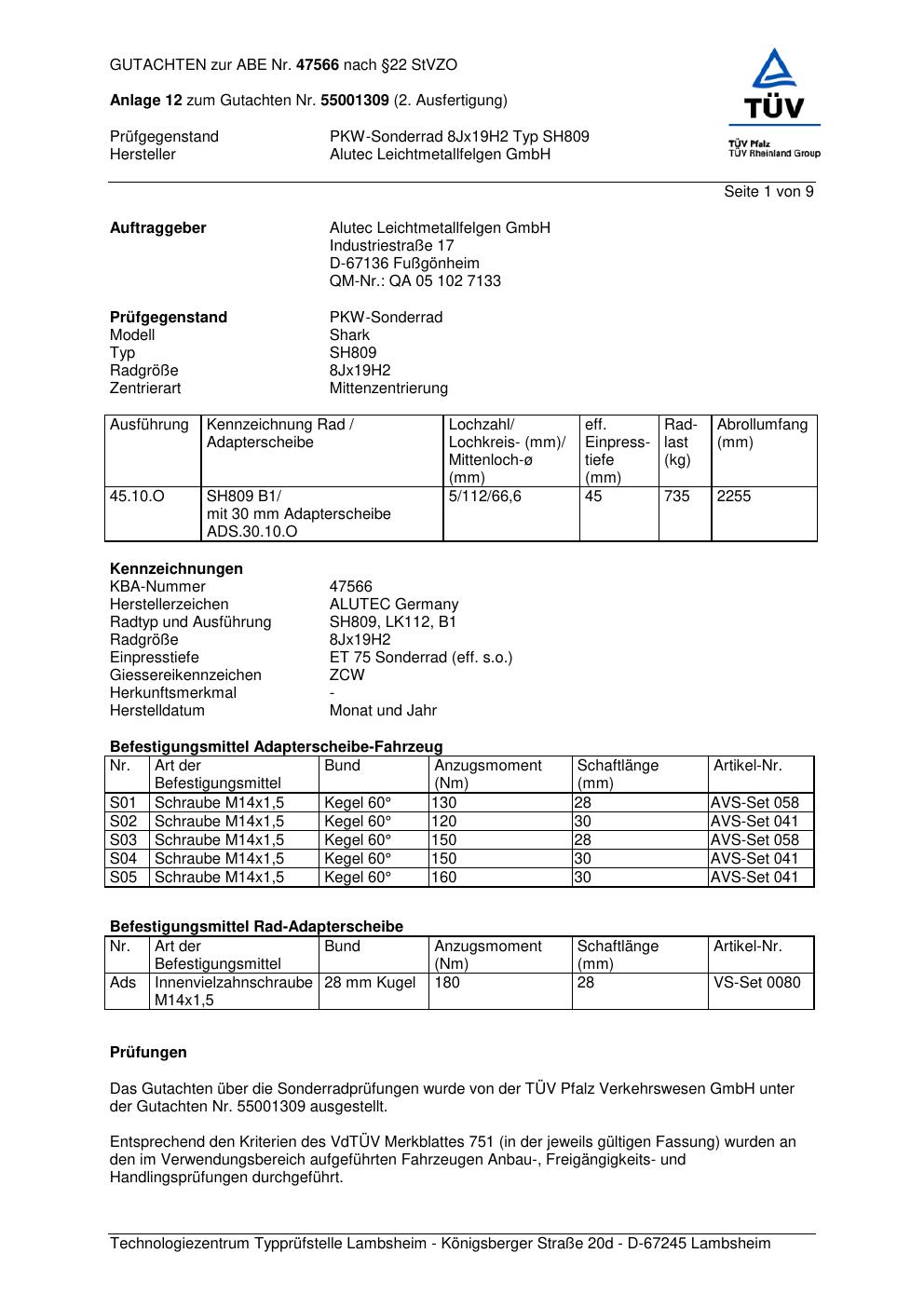 Dieses Gutachten (abe) bezieht sich auf die Alufelge ALUTEC SH809 in der Ausführung 8Jx19 ET 0, Mittenloch 0 mm (KBA 47566). Im PDF findest du typischerweise zulässige Reifengrößen, Auflagen/Anbauhinweise und – je nach Dokument – Hinweise zur Eintragung.