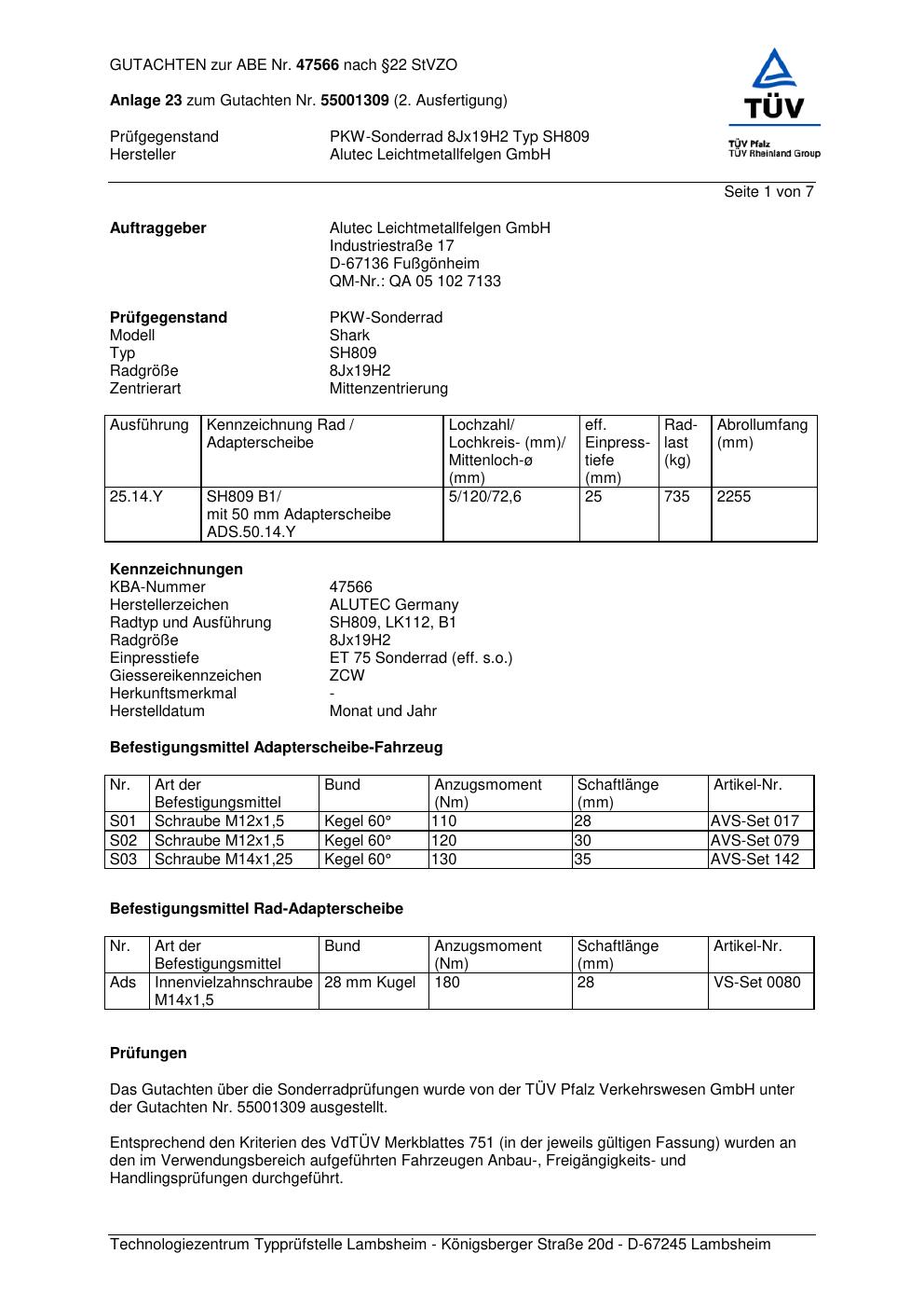 Dieses Gutachten (abe) bezieht sich auf die Alufelge ALUTEC SH809 in der Ausführung 8Jx19 ET 0, Mittenloch 0 mm (KBA 47566). Im PDF findest du typischerweise zulässige Reifengrößen, Auflagen/Anbauhinweise und – je nach Dokument – Hinweise zur Eintragung.
