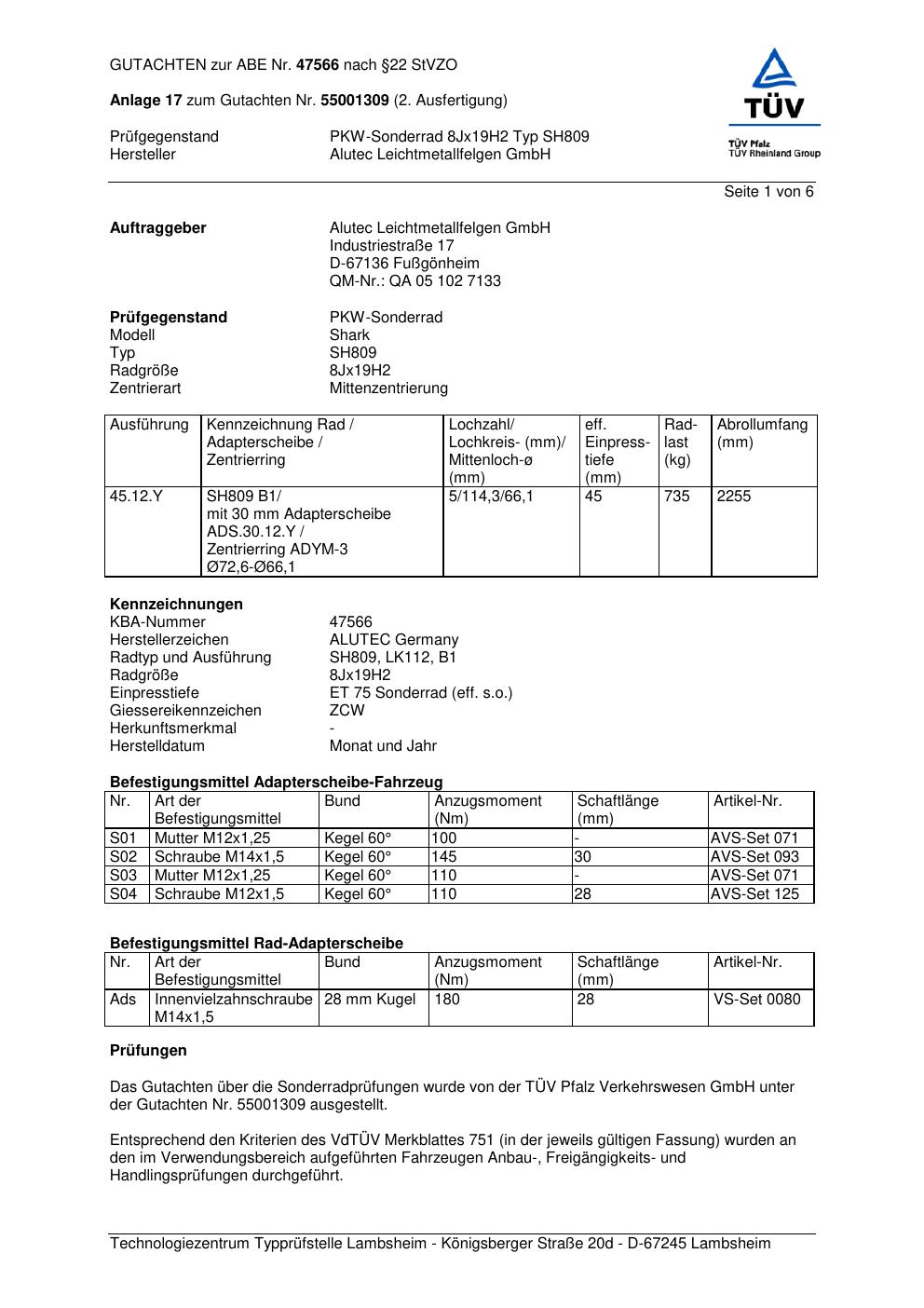 Dieses Gutachten (abe) bezieht sich auf die Alufelge ALUTEC SH809 in der Ausführung 8Jx19 ET 0, Mittenloch 0 mm (KBA 47566). Im PDF findest du typischerweise zulässige Reifengrößen, Auflagen/Anbauhinweise und – je nach Dokument – Hinweise zur Eintragung.