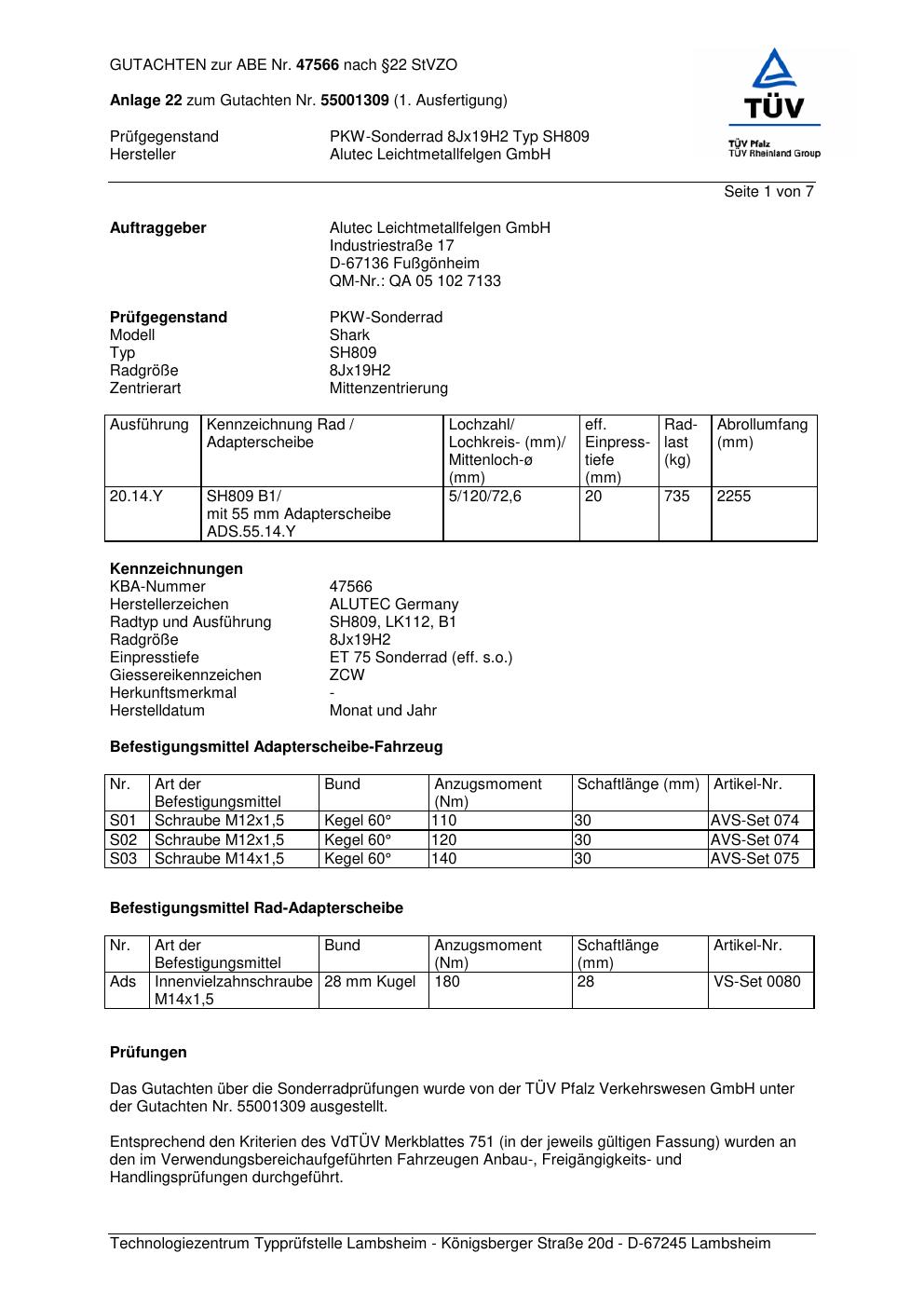Dieses Gutachten (abe) bezieht sich auf die Alufelge ALUTEC SH809 in der Ausführung 8Jx19 ET 0, Mittenloch 0 mm (KBA 47566). Im PDF findest du typischerweise zulässige Reifengrößen, Auflagen/Anbauhinweise und – je nach Dokument – Hinweise zur Eintragung.