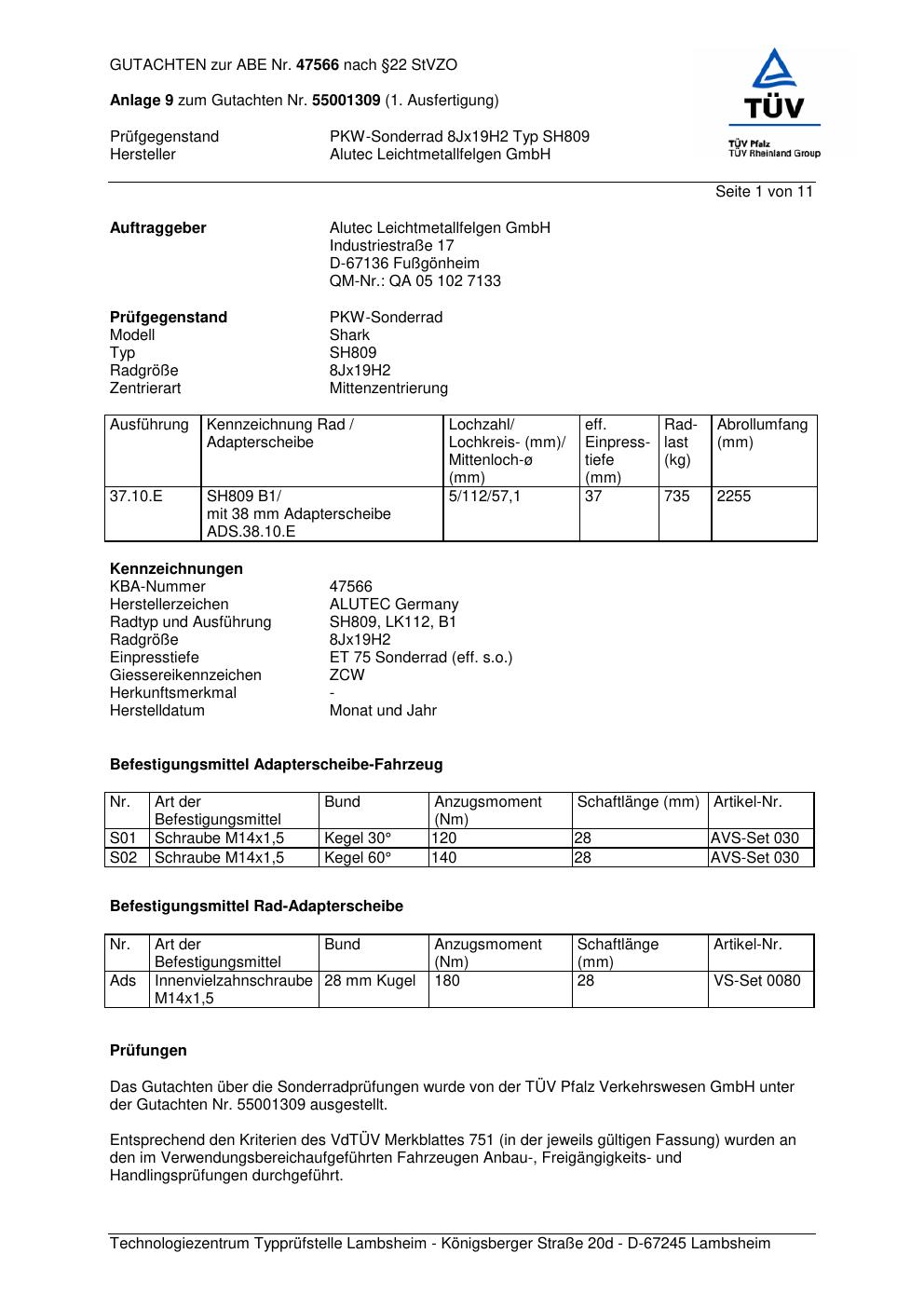 Dieses Gutachten (abe) bezieht sich auf die Alufelge ALUTEC SH809 in der Ausführung 8Jx19 ET 0, Mittenloch 0 mm (KBA 47566). Im PDF findest du typischerweise zulässige Reifengrößen, Auflagen/Anbauhinweise und – je nach Dokument – Hinweise zur Eintragung.