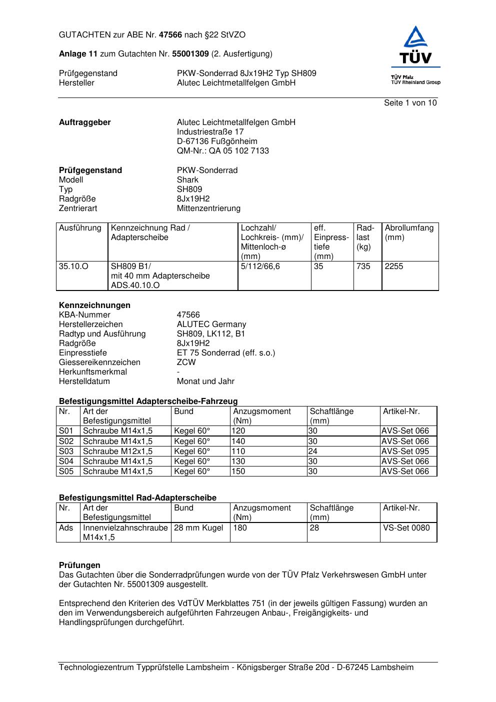 Dieses Gutachten (abe) bezieht sich auf die Alufelge ALUTEC SH809 in der Ausführung 8Jx19 ET 0, Mittenloch 0 mm (KBA 47566). Im PDF findest du typischerweise zulässige Reifengrößen, Auflagen/Anbauhinweise und – je nach Dokument – Hinweise zur Eintragung.