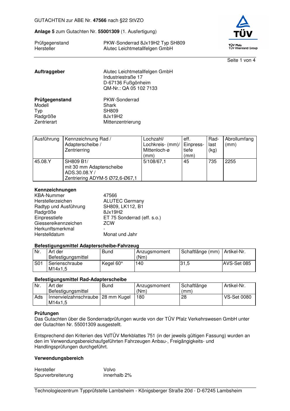 Dieses Gutachten (abe) bezieht sich auf die Alufelge ALUTEC SH809 in der Ausführung 8Jx19 ET 0, Mittenloch 0 mm (KBA 47566). Im PDF findest du typischerweise zulässige Reifengrößen, Auflagen/Anbauhinweise und – je nach Dokument – Hinweise zur Eintragung.