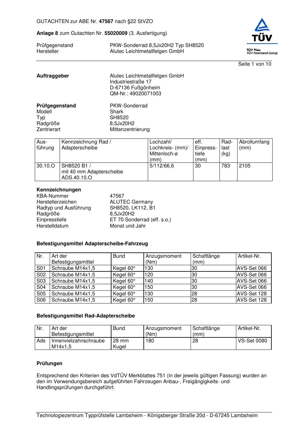 Felgengutachten / abe für Alufelgen ALUTEC SH8520 (8.5Jx2 ET 0, Mittenloch 0 mm) mit KBA 47567 (Zertifikatsnummer 47567). Hier kostenlos als PDF herunterladen. Der Download-Link ist 24 Stunden gültig und kann bis zu zwei Mal verwendet werden.