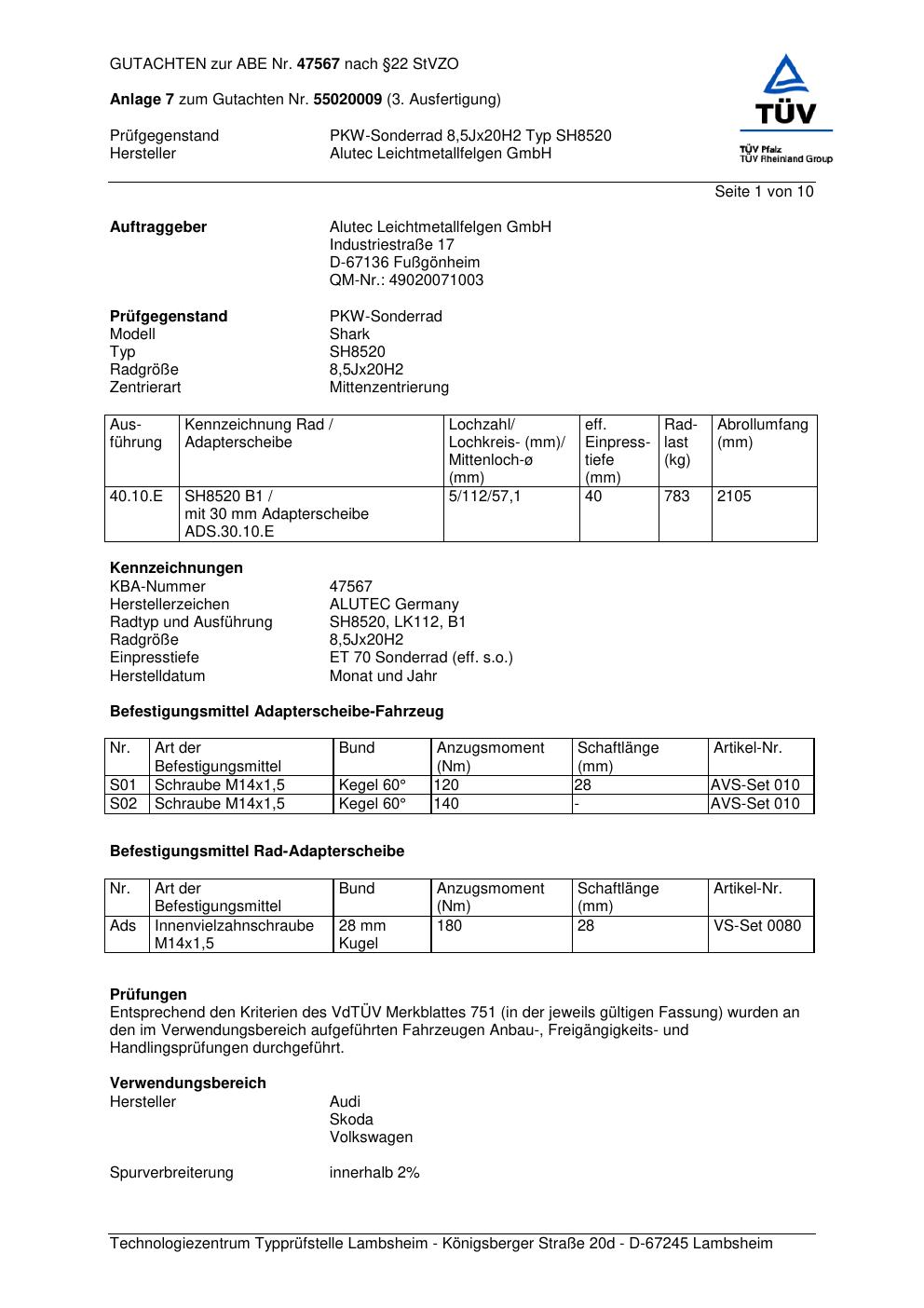 Felgengutachten / abe für Alufelgen ALUTEC SH8520 (8.5Jx2 ET 0, Mittenloch 0 mm) mit KBA 47567 (Zertifikatsnummer 47567). Hier kostenlos als PDF herunterladen. Der Download-Link ist 24 Stunden gültig und kann bis zu zwei Mal verwendet werden.