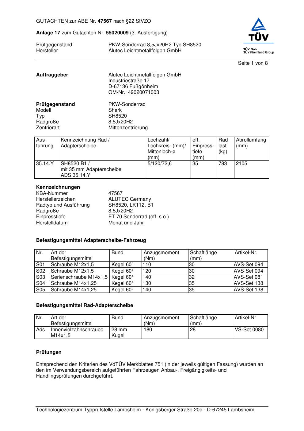 Felgengutachten / abe für Alufelgen ALUTEC SH8520 (8.5Jx2 ET 0, Mittenloch 0 mm) mit KBA 47567 (Zertifikatsnummer 47567). Hier kostenlos als PDF herunterladen. Der Download-Link ist 24 Stunden gültig und kann bis zu zwei Mal verwendet werden.