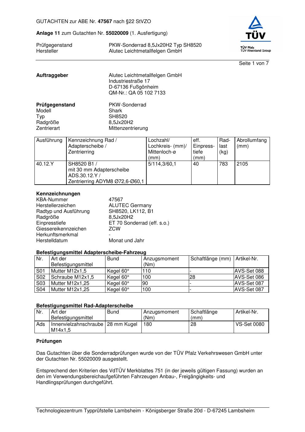 Felgengutachten / abe für Alufelgen ALUTEC SH8520 (8.5Jx2 ET 0, Mittenloch 0 mm) mit KBA 47567 (Zertifikatsnummer 47567). Hier kostenlos als PDF herunterladen. Der Download-Link ist 24 Stunden gültig und kann bis zu zwei Mal verwendet werden.