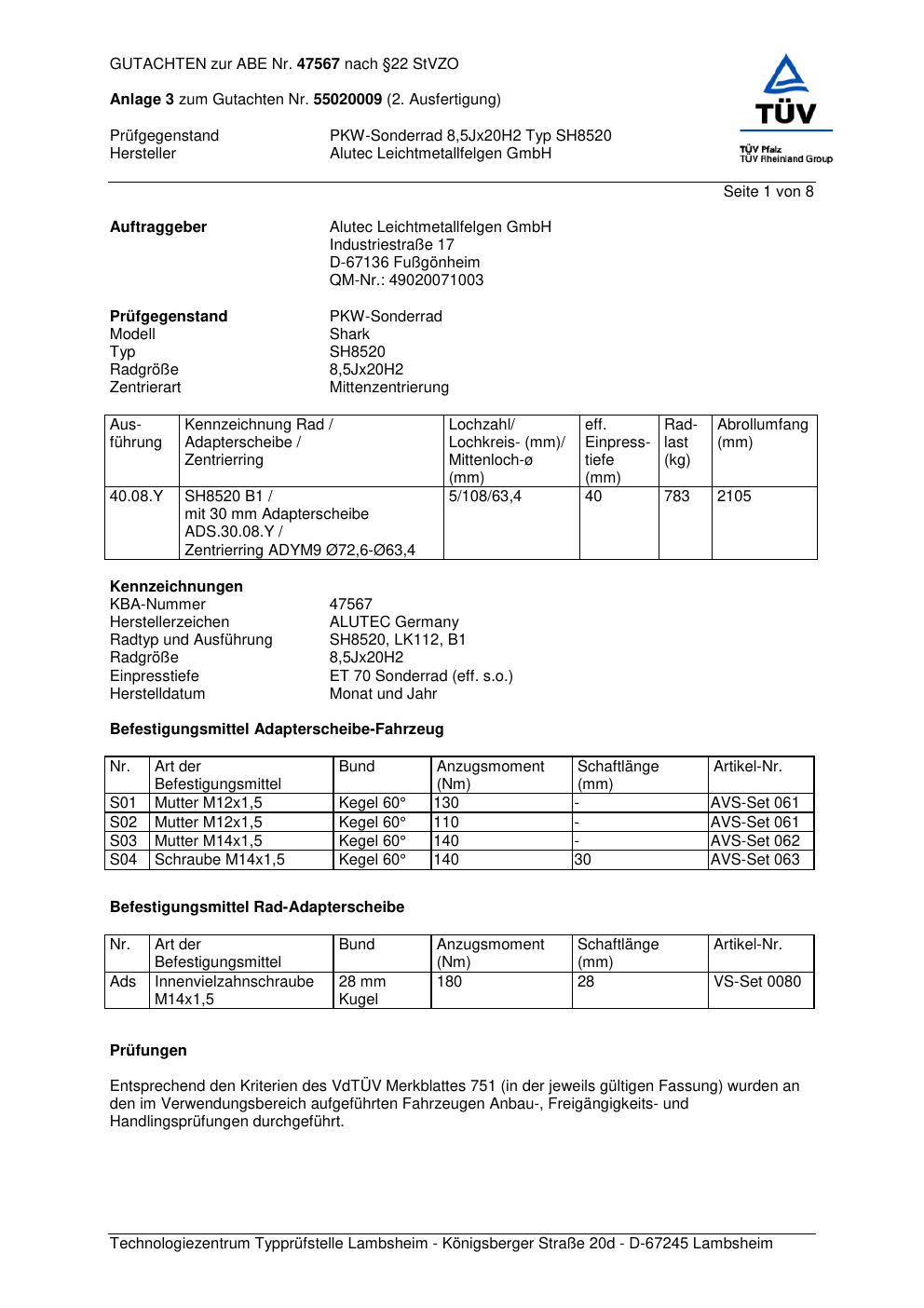 Felgengutachten / abe für Alufelgen ALUTEC SH8520 (8.5Jx2 ET 0, Mittenloch 0 mm) mit KBA 47567 (Zertifikatsnummer 47567). Hier kostenlos als PDF herunterladen. Der Download-Link ist 24 Stunden gültig und kann bis zu zwei Mal verwendet werden.