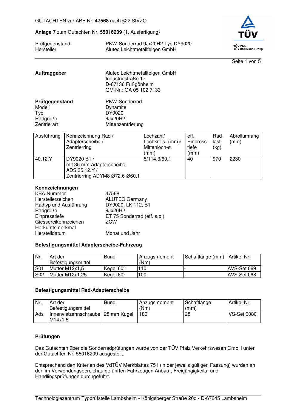 Felgengutachten / abe für Alufelgen ALUTEC DY9020 (9Jx2 ET 0, Mittenloch 0 mm) mit KBA 47568 (Zertifikatsnummer 47568). Hier kostenlos als PDF herunterladen. Der Download-Link ist 24 Stunden gültig und kann bis zu zwei Mal verwendet werden.