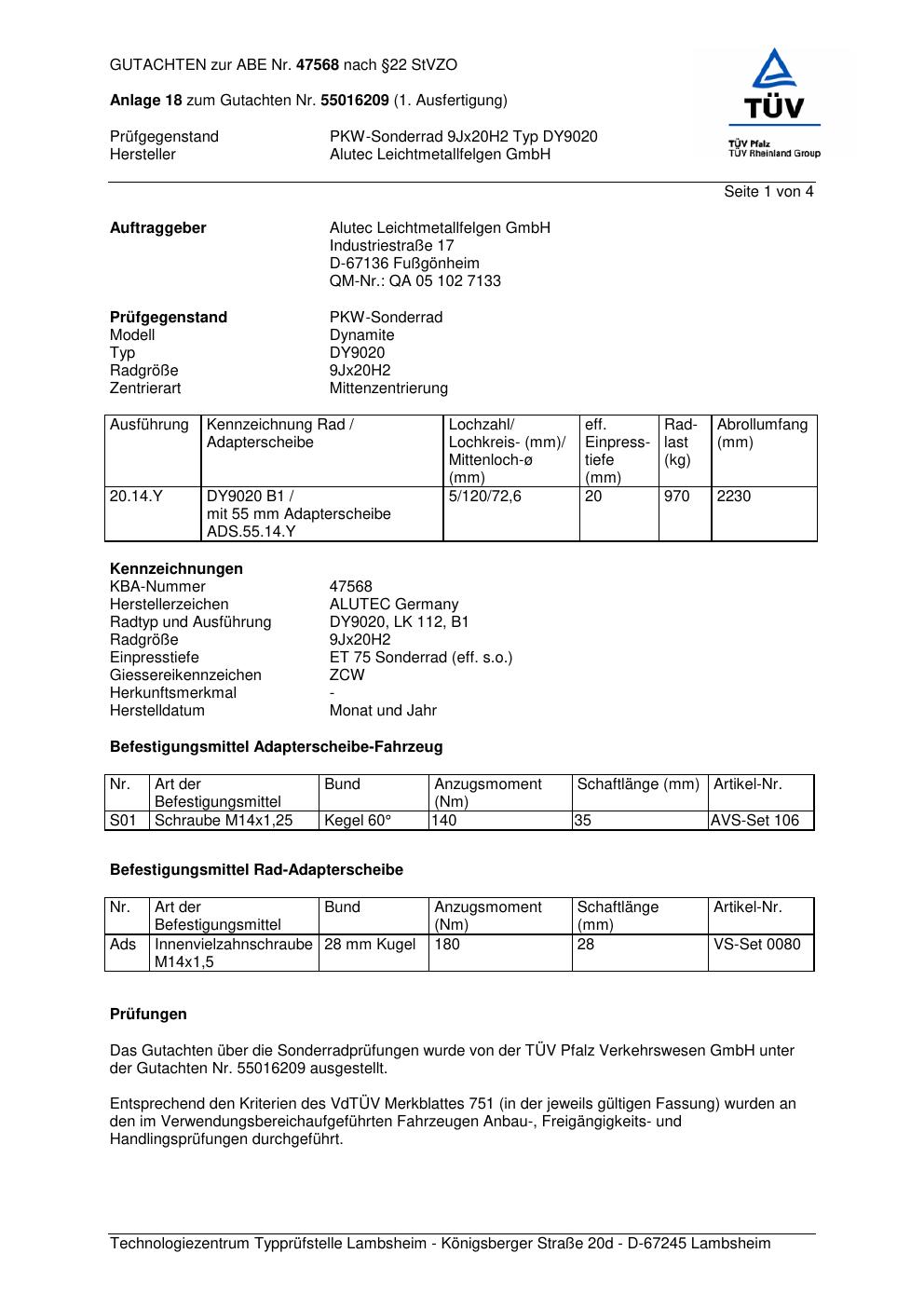 Dieses Gutachten (abe) bezieht sich auf die Alufelge ALUTEC DY9020 in der Ausführung 9Jx2 ET 0, Mittenloch 0 mm (KBA 47568). Im PDF findest du typischerweise zulässige Reifengrößen, Auflagen/Anbauhinweise und – je nach Dokument – Hinweise zur Eintragung.