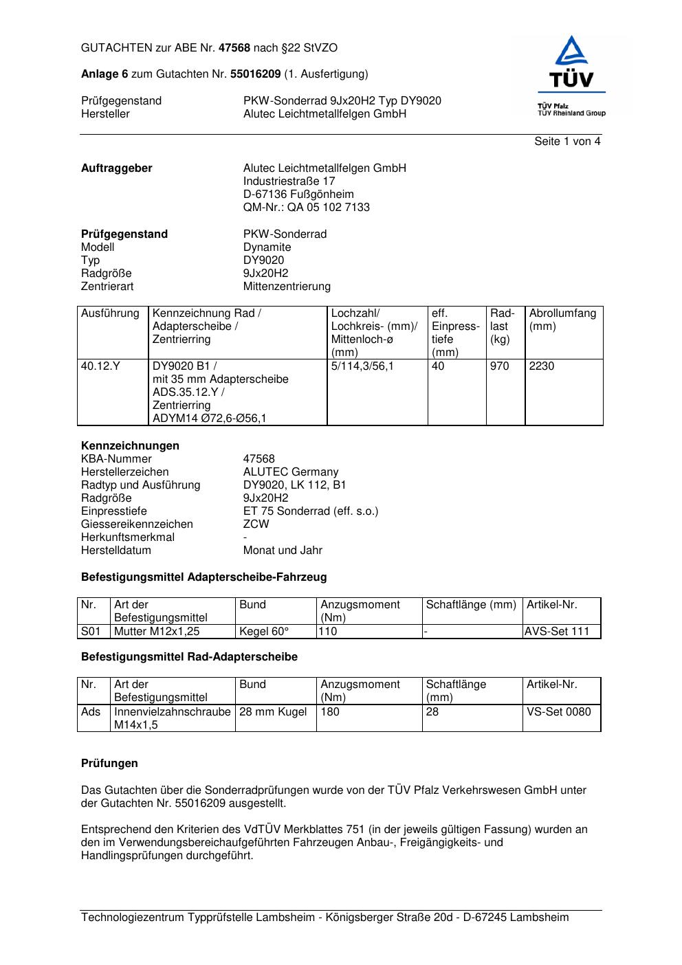 Dieses Gutachten (abe) bezieht sich auf die Alufelge ALUTEC DY9020 in der Ausführung 9Jx2 ET 0, Mittenloch 0 mm (KBA 47568). Im PDF findest du typischerweise zulässige Reifengrößen, Auflagen/Anbauhinweise und – je nach Dokument – Hinweise zur Eintragung.