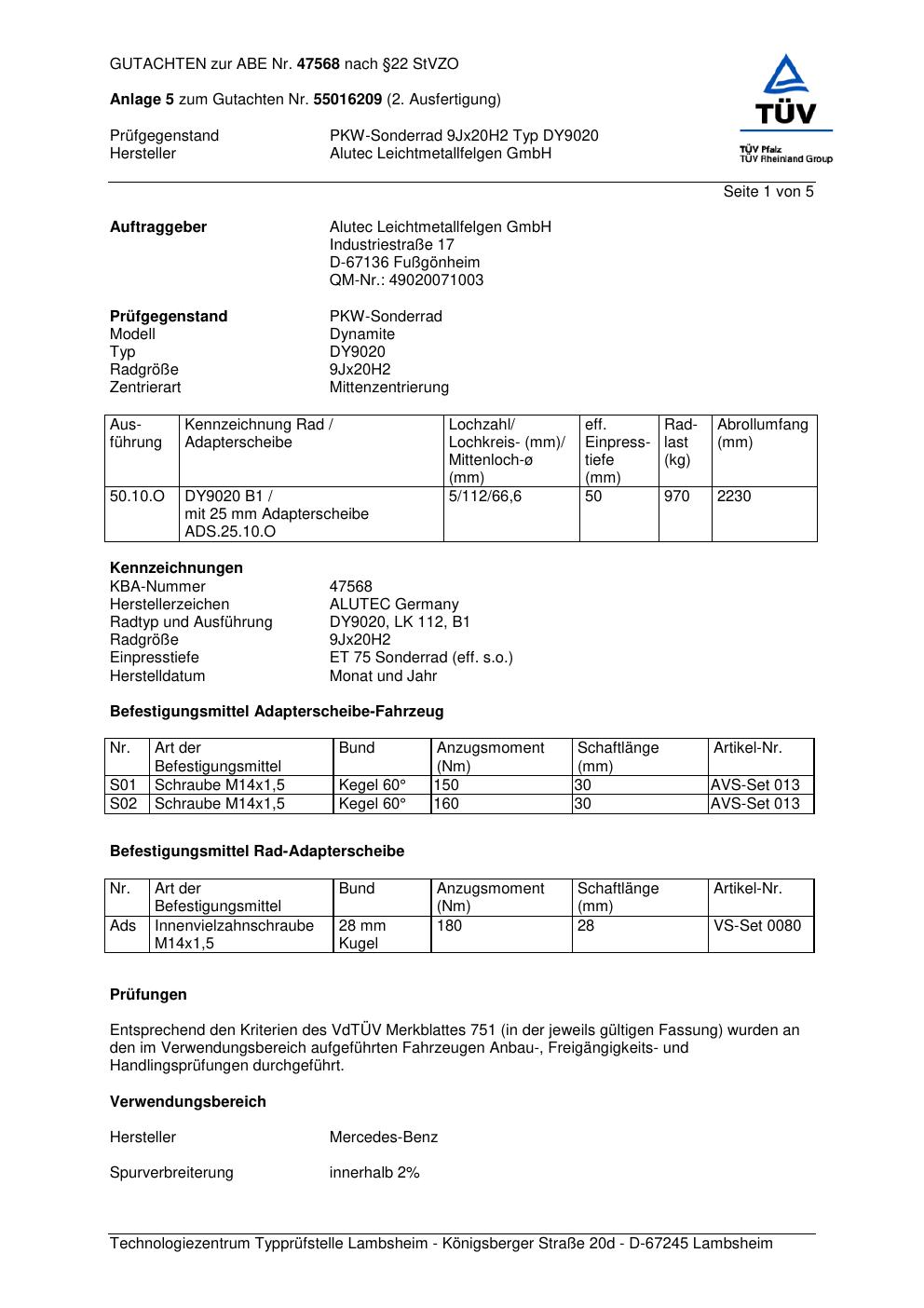 Dieses Gutachten (abe) bezieht sich auf die Alufelge ALUTEC DY9020 in der Ausführung 9Jx2 ET 0, Mittenloch 0 mm (KBA 47568). Im PDF findest du typischerweise zulässige Reifengrößen, Auflagen/Anbauhinweise und – je nach Dokument – Hinweise zur Eintragung.