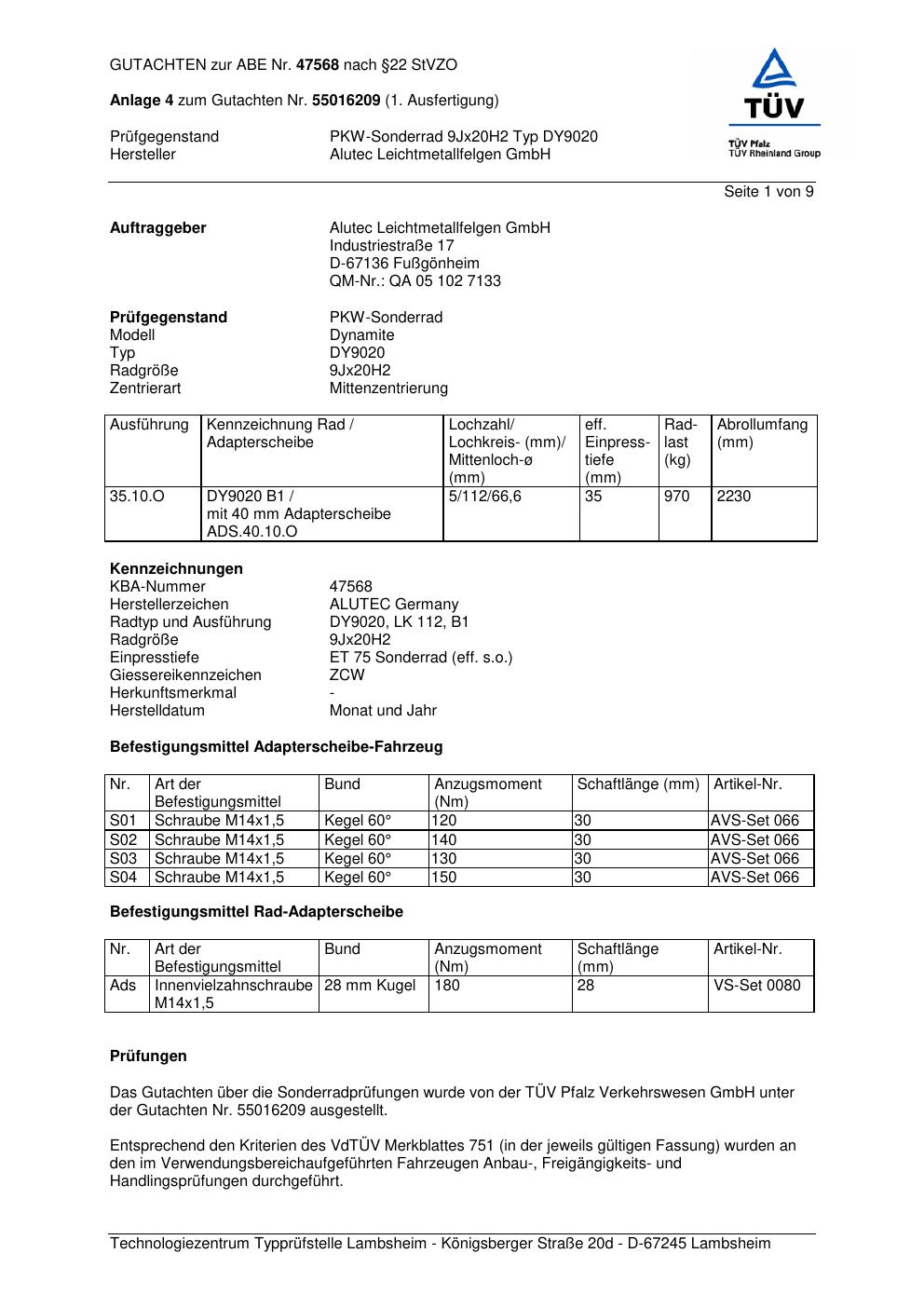 Dieses Gutachten (abe) bezieht sich auf die Alufelge ALUTEC DY9020 in der Ausführung 9Jx2 ET 0, Mittenloch 0 mm (KBA 47568). Im PDF findest du typischerweise zulässige Reifengrößen, Auflagen/Anbauhinweise und – je nach Dokument – Hinweise zur Eintragung.