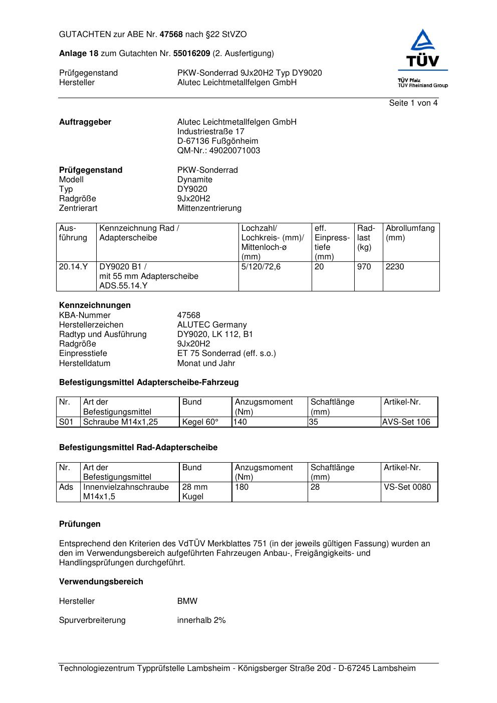 Dieses Gutachten (abe) bezieht sich auf die Alufelge ALUTEC DY9020 in der Ausführung 9Jx2 ET 0, Mittenloch 0 mm (KBA 47568). Im PDF findest du typischerweise zulässige Reifengrößen, Auflagen/Anbauhinweise und – je nach Dokument – Hinweise zur Eintragung.