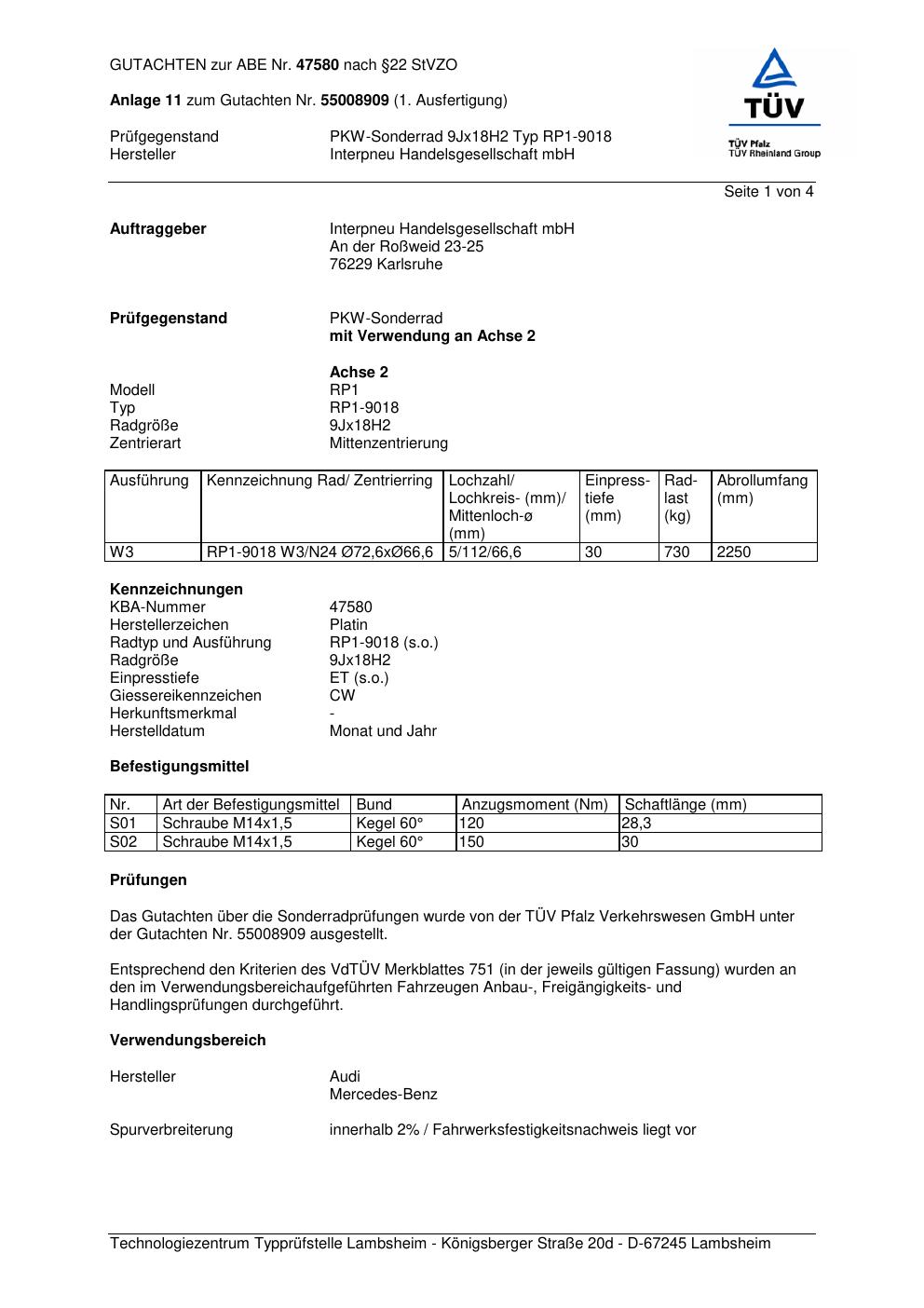 Dieses Gutachten (abe) bezieht sich auf die Alufelge Platin RP1-9018 in der Ausführung 9Jx18 ET 0, Mittenloch 0 mm (KBA 47580). Im PDF findest du typischerweise zulässige Reifengrößen, Auflagen/Anbauhinweise und – je nach Dokument – Hinweise zur Eintragung.