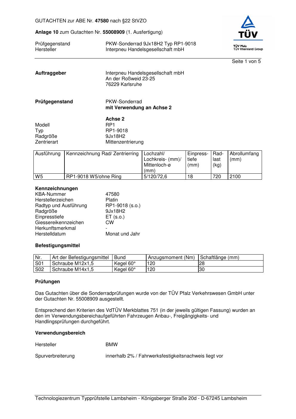 Dieses Gutachten (abe) bezieht sich auf die Alufelge Platin RP1-9018 in der Ausführung 9Jx18 ET 0, Mittenloch 0 mm (KBA 47580). Im PDF findest du typischerweise zulässige Reifengrößen, Auflagen/Anbauhinweise und – je nach Dokument – Hinweise zur Eintragung.