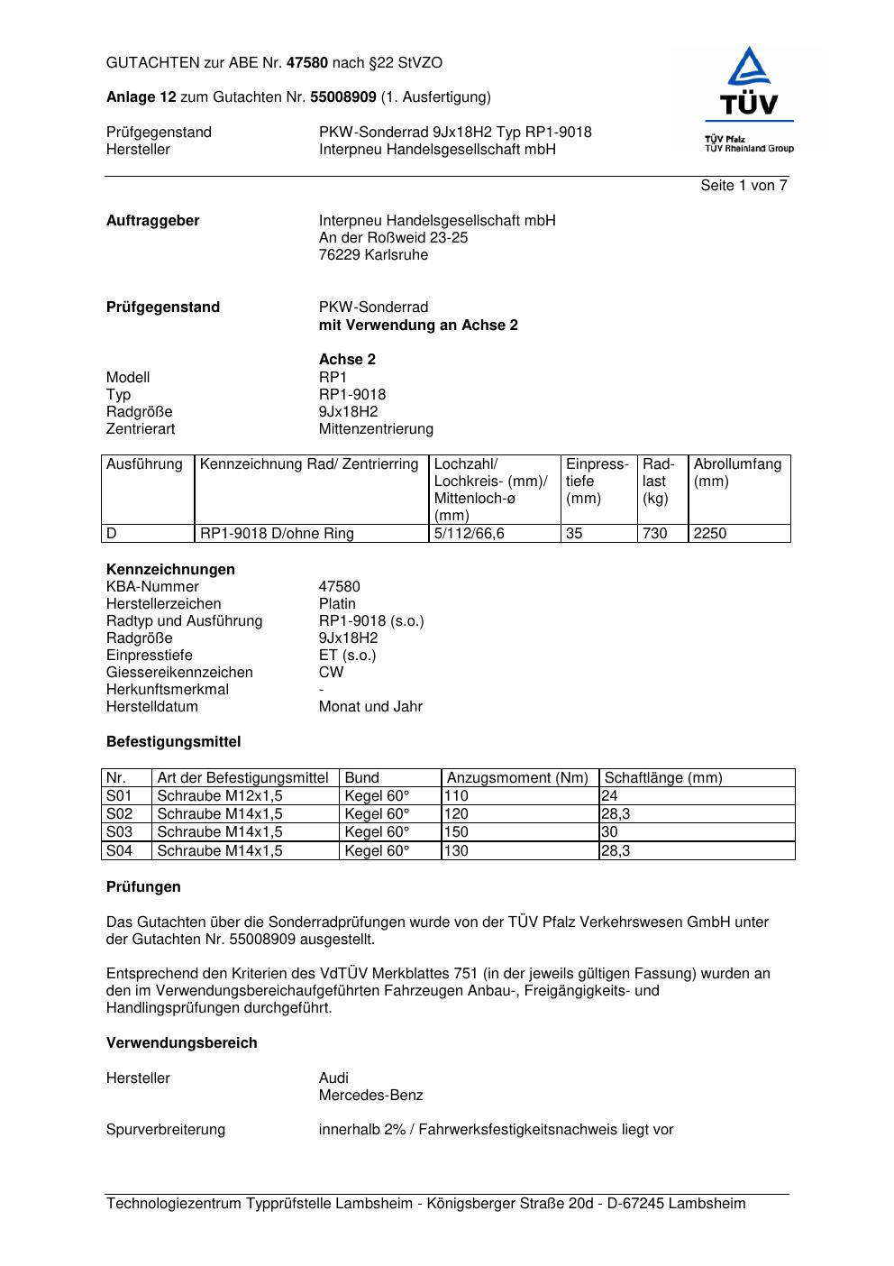 Dieses Gutachten (abe) bezieht sich auf die Alufelge Platin RP1-9018 in der Ausführung 9Jx18 ET 0, Mittenloch 0 mm (KBA 47580). Im PDF findest du typischerweise zulässige Reifengrößen, Auflagen/Anbauhinweise und – je nach Dokument – Hinweise zur Eintragung.
