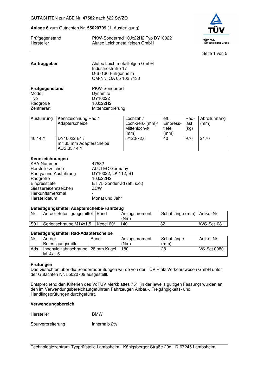 Dieses Gutachten (abe) bezieht sich auf die Alufelge ALUTEC DY10022 in der Ausführung 10Jx22 ET 0, Mittenloch 0 mm (KBA 47582). Im PDF findest du typischerweise zulässige Reifengrößen, Auflagen/Anbauhinweise und – je nach Dokument – Hinweise zur Eintragung.