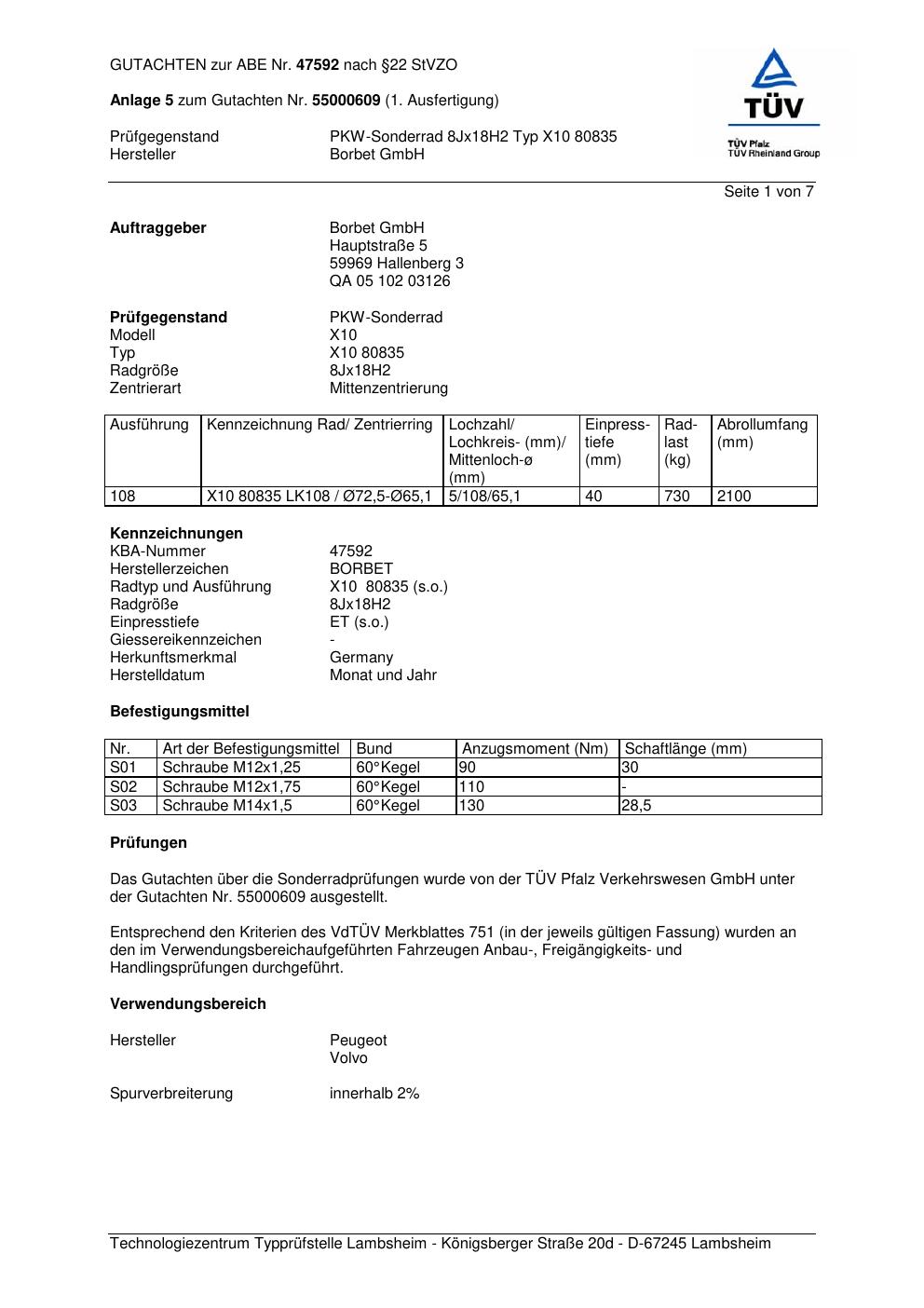 Dieses Gutachten (abe) bezieht sich auf die Alufelge Borbet X10 80835 in der Ausführung 8Jx18 ET 0, Mittenloch 0 mm (KBA 47592). Im PDF findest du typischerweise zulässige Reifengrößen, Auflagen/Anbauhinweise und – je nach Dokument – Hinweise zur Eintragung.