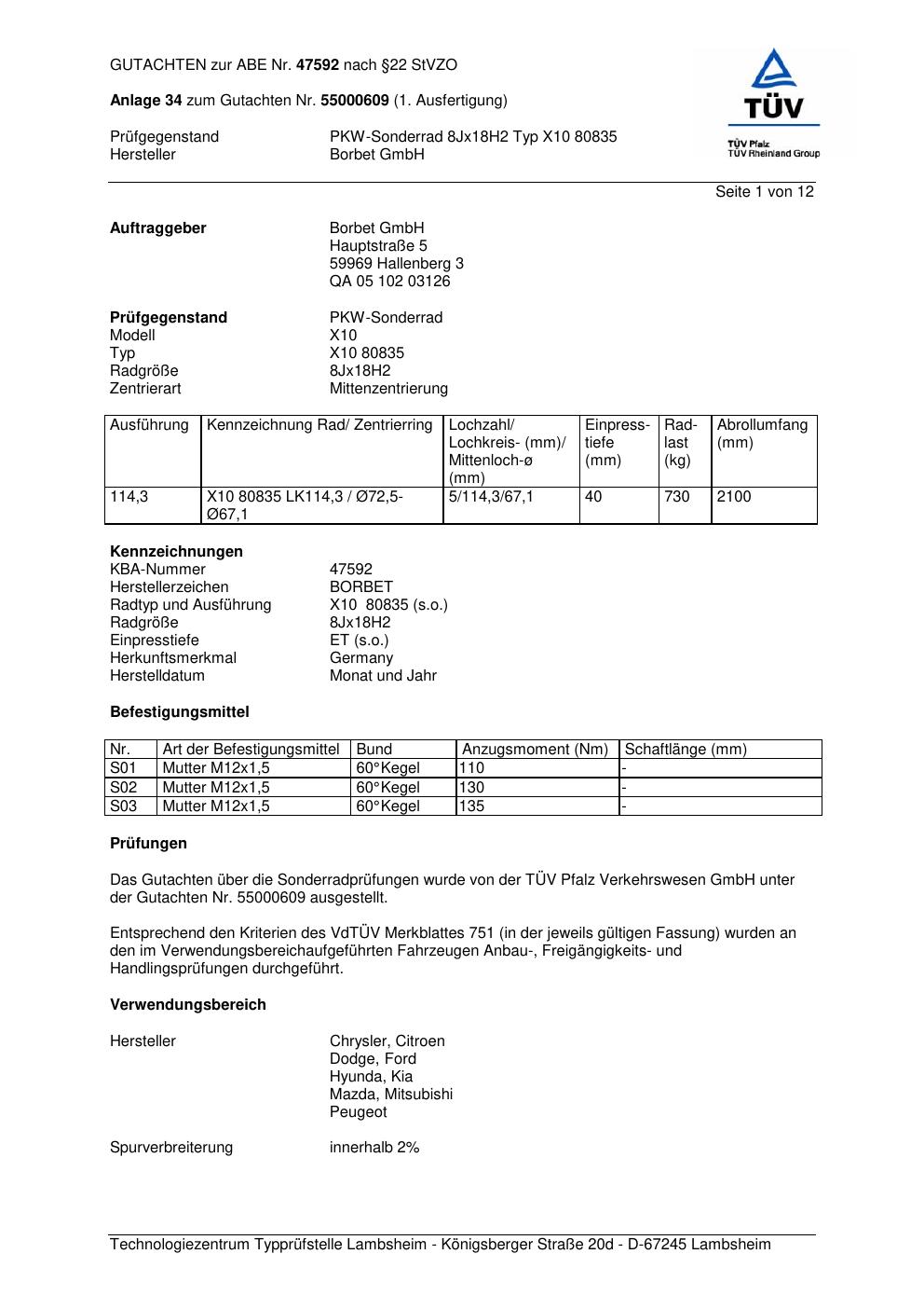 Dieses Gutachten (abe) bezieht sich auf die Alufelge Borbet X10 80835 in der Ausführung 8Jx18 ET 0, Mittenloch 0 mm (KBA 47592). Im PDF findest du typischerweise zulässige Reifengrößen, Auflagen/Anbauhinweise und – je nach Dokument – Hinweise zur Eintragung.
