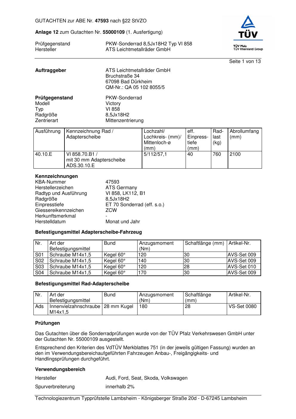 Dieses Gutachten (abe) bezieht sich auf die Alufelge ATS VI 858 in der Ausführung 8.5Jx18 ET 0, Mittenloch 0 mm (KBA 47593). Im PDF findest du typischerweise zulässige Reifengrößen, Auflagen/Anbauhinweise und – je nach Dokument – Hinweise zur Eintragung.