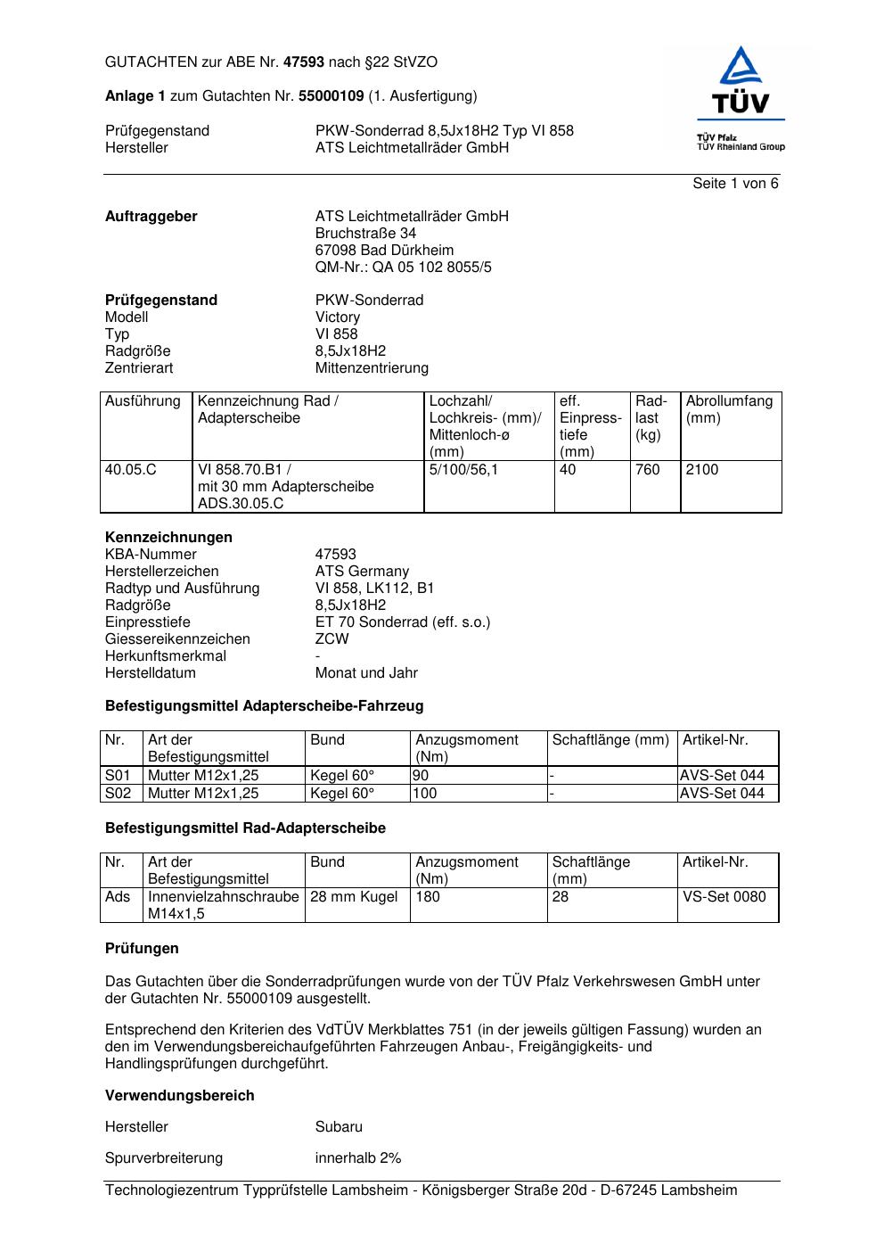 Dieses Gutachten (abe) bezieht sich auf die Alufelge ATS VI 858 in der Ausführung 8.5Jx18 ET 0, Mittenloch 0 mm (KBA 47593). Im PDF findest du typischerweise zulässige Reifengrößen, Auflagen/Anbauhinweise und – je nach Dokument – Hinweise zur Eintragung.