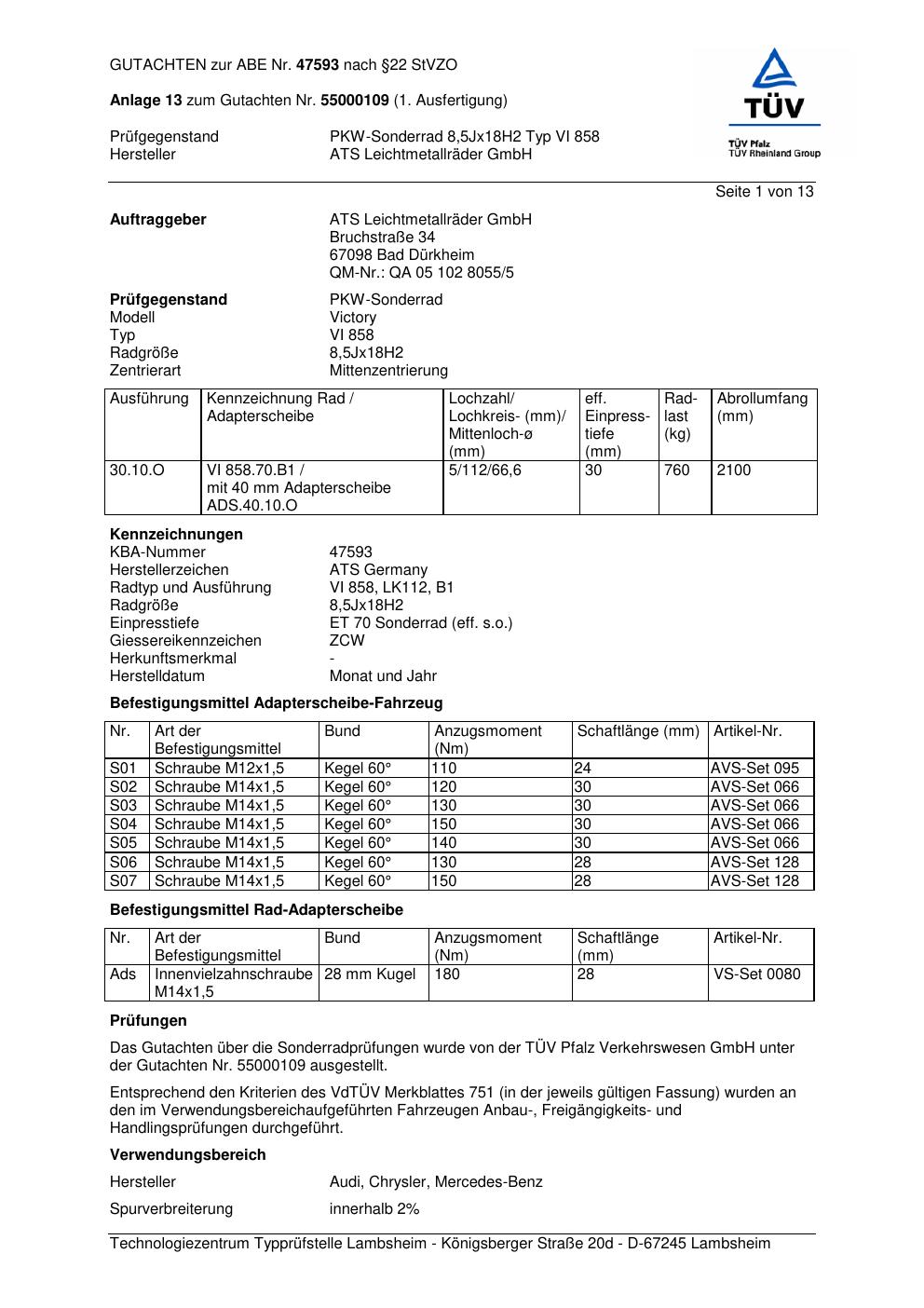 Dieses Gutachten (abe) bezieht sich auf die Alufelge ATS VI 858 in der Ausführung 8.5Jx18 ET 0, Mittenloch 0 mm (KBA 47593). Im PDF findest du typischerweise zulässige Reifengrößen, Auflagen/Anbauhinweise und – je nach Dokument – Hinweise zur Eintragung.