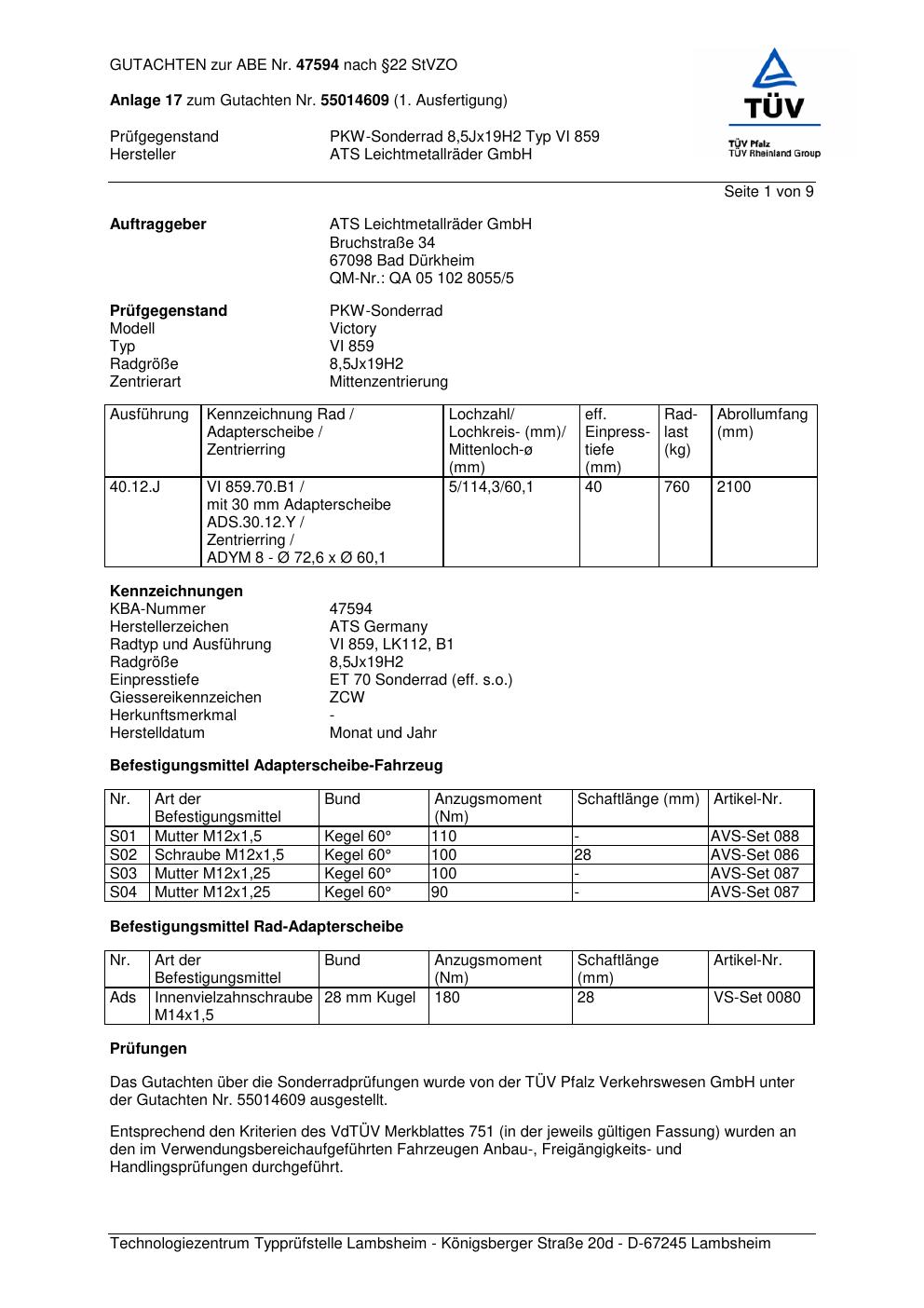 Dieses Gutachten (abe) bezieht sich auf die Alufelge ATS VI 859 in der Ausführung 8.5Jx19 ET 0, Mittenloch 0 mm (KBA 47594). Im PDF findest du typischerweise zulässige Reifengrößen, Auflagen/Anbauhinweise und – je nach Dokument – Hinweise zur Eintragung.