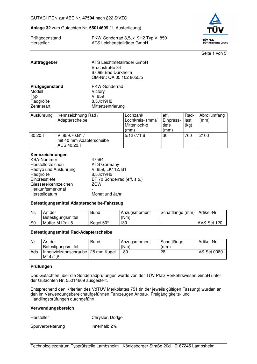 Dieses Gutachten (abe) bezieht sich auf die Alufelge ATS VI 859 in der Ausführung 8.5Jx19 ET 0, Mittenloch 0 mm (KBA 47594). Im PDF findest du typischerweise zulässige Reifengrößen, Auflagen/Anbauhinweise und – je nach Dokument – Hinweise zur Eintragung.