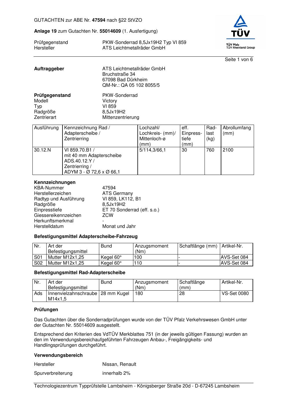 Dieses Gutachten (abe) bezieht sich auf die Alufelge ATS VI 859 in der Ausführung 8.5Jx19 ET 0, Mittenloch 0 mm (KBA 47594). Im PDF findest du typischerweise zulässige Reifengrößen, Auflagen/Anbauhinweise und – je nach Dokument – Hinweise zur Eintragung.