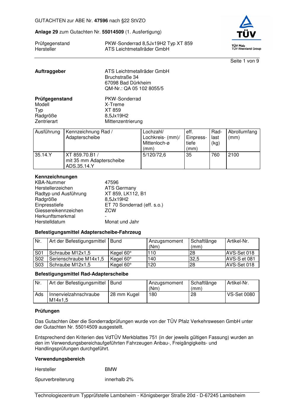 Dieses Gutachten (abe) bezieht sich auf die Alufelge ATS XT 859 in der Ausführung 8.5Jx19 ET 0, Mittenloch 0 mm (KBA 47596). Im PDF findest du typischerweise zulässige Reifengrößen, Auflagen/Anbauhinweise und – je nach Dokument – Hinweise zur Eintragung.