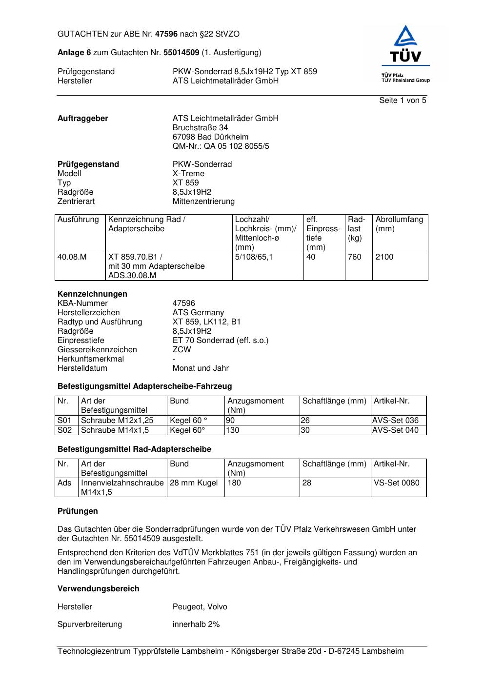Dieses Gutachten (abe) bezieht sich auf die Alufelge ATS XT 859 in der Ausführung 8.5Jx19 ET 0, Mittenloch 0 mm (KBA 47596). Im PDF findest du typischerweise zulässige Reifengrößen, Auflagen/Anbauhinweise und – je nach Dokument – Hinweise zur Eintragung.