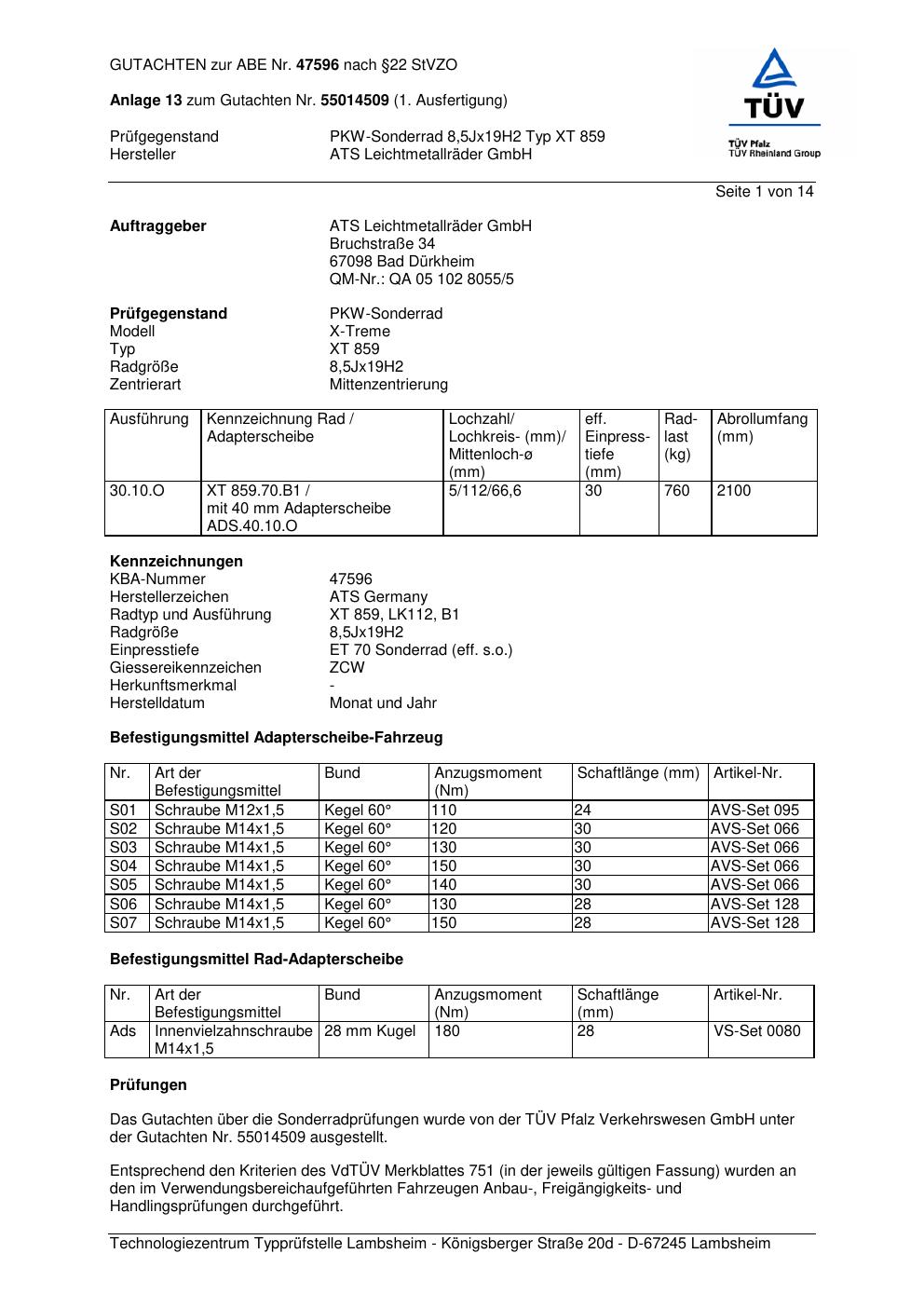 Dieses Gutachten (abe) bezieht sich auf die Alufelge ATS XT 859 in der Ausführung 8.5Jx19 ET 0, Mittenloch 0 mm (KBA 47596). Im PDF findest du typischerweise zulässige Reifengrößen, Auflagen/Anbauhinweise und – je nach Dokument – Hinweise zur Eintragung.