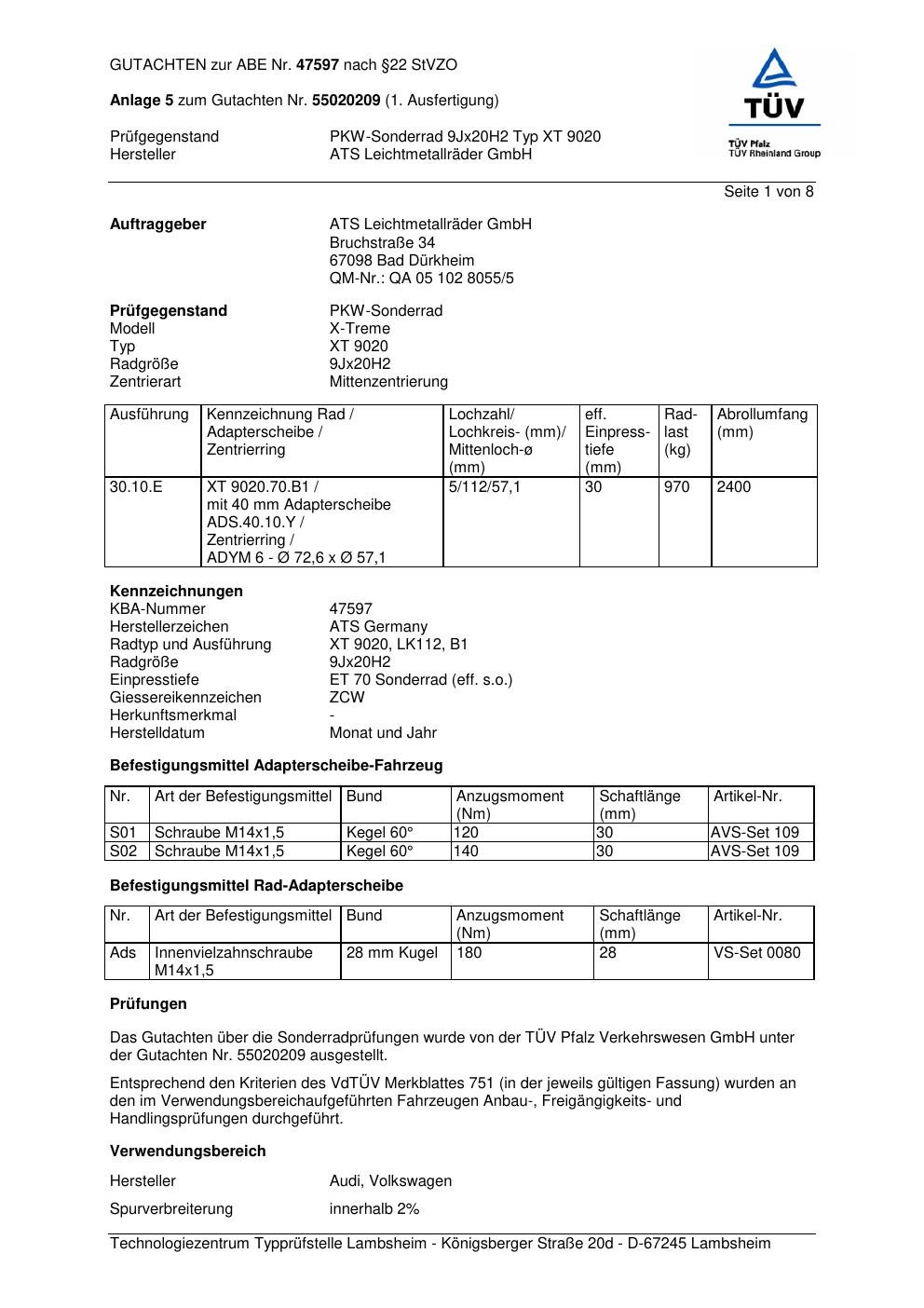 Dieses Gutachten (abe) bezieht sich auf die Alufelge ATS XT 9020 in der Ausführung 9Jx2 ET 0, Mittenloch 0 mm (KBA 47597). Im PDF findest du typischerweise zulässige Reifengrößen, Auflagen/Anbauhinweise und – je nach Dokument – Hinweise zur Eintragung.