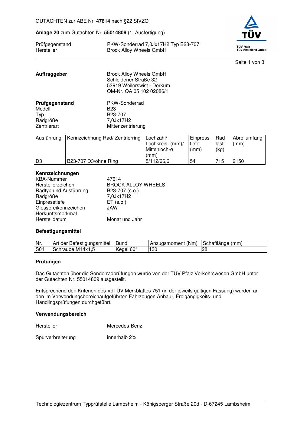 Dieses Gutachten (abe) bezieht sich auf die Alufelge Brock B23-707 in der Ausführung 7Jx17 ET 0, Mittenloch 0 mm (KBA 47614). Im PDF findest du typischerweise zulässige Reifengrößen, Auflagen/Anbauhinweise und – je nach Dokument – Hinweise zur Eintragung.